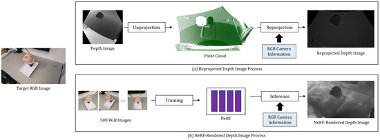 Reprojected depth image and NeRF-rendered depth image: (a) Reprojected Depth Image Process, (b) NeRF-Rendered Depth Image Process.