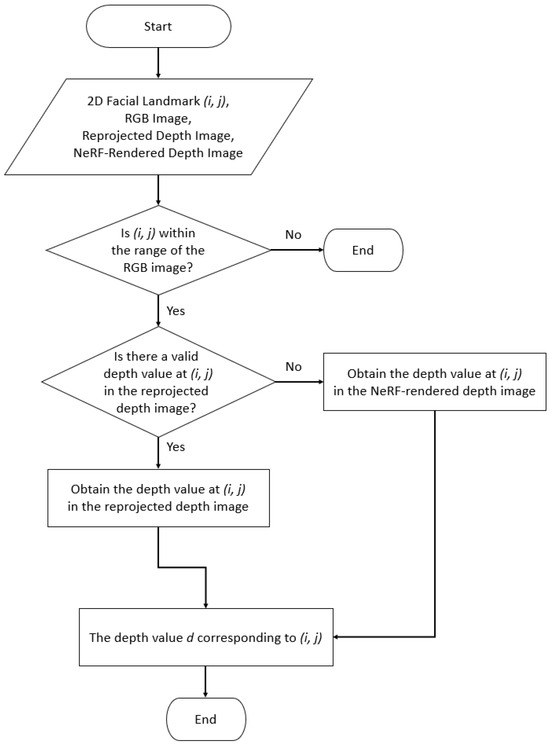 We obtained 3D facial landmarks by unprojecting the 2D corresponding landmarks on an RGB image with the paired depth images and intrinsic camera parameters. The algorithm for corresponding depth values (pixels) to 2D facial landmarks is illustrated in Figure 3. It confirms whether the coordinates of the 2D facial landmarks fall within the image resolution boundaries. Since the 2D facial landmarks include all 19 points predefined by the model, if only the mouth is visible in the image and the chin is not, the model will assign points to likely positions outside the image boundaries. It then fetches a depth value at the corresponding pixel location in the reprojected depth image. If the depth value is available, the 3D location of 2D facial landmarks is retrieved; otherwise, we used the NeRF-rendered depth image. This process is repeated for every 2D facial landmark.