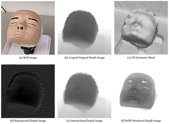 In Figure 4, we compare the quality of depth (geometry) among different depth images. Here, the original depth image (See Figure 4b) is currently cropped to appear similar to other images, but it does not actually match the geometry of the facial phantom (see Figure 4a) perfectly, so its use is inappropriate for extracting 3D facial landmarks. The approach that uses 3D mesh suffers from regions with crucial depth differences or depth holes (see the nose being noticeably blurred in Figure 4c). In contrast, the use of the reprojected and interpolated depth image (see Figure 4e) demonstrates relatively uniform filling in the nose regions, i.e., alleviated depth loss. However, regions with sharp depth changes or large depth holes, such as along contours, still appear distorted or scattered. In comparison, NeRF-rendered depth images (i.e., our approach) ensure that all structures retain clear and well-defined shapes.
