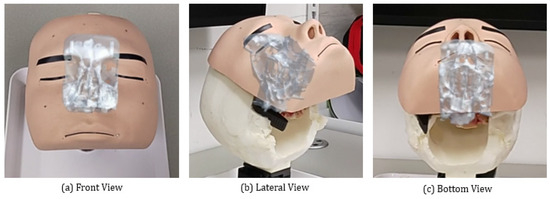 The augmentation results of the CT rendering onto the physical phantom using the transformation matrix from our approach: (a) front view, (b) lateral view, and (c) bottom view.