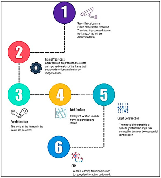 Subsequently, the system constructs a graph from the detected joints in each frame, where a node represents a specific joint and edges denote the connections between the same joint in two consecutive frames. This graph-based representation encapsulates both spatial relationships and temporal dynamics, offering a detailed understanding of human movement. Finally, a convolutional neural network (CNN) is employed to analyze these graphs. The CNN, trained on various patterns in the graph data, classifies the observed activities by interpreting the spatial–temporal dynamics inherent in the joint movements. This architecture is designed to efficiently and accurately recognize human activities, making it applicable in fields like public safety, healthcare monitoring, and smart surveillance. By integrating graph structures with deep learning techniques, the system aims to deliver robust and reliable activity recognition, even in complex and dynamic environments.