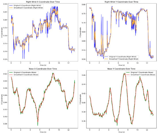 The original data, depicted in the top subplots of Figure 2, exhibit noticeable variability, indicating potential noise or rapid movements. In contrast, the smoothed version offers a clearer depiction of the overall movement patterns by reducing the influence of noise. This smoothing effect is particularly evident in the right wrist coordinates, where fluctuations are significantly attenuated.
