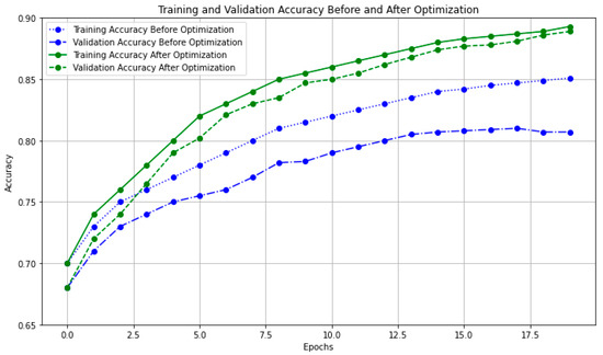 The training and validation before and after optimization are depicted in Figure 5. Before optimization, the training accuracy steadily increased and plateaued at around 85.1%, indicating that the model was learning effectively but had reached its performance limit. The validation accuracy, however, reached only about 81.7%, suggesting that the model’s performance on unseen data was weaker compared to the training data. The noticeable gap between training and validation accuracies before optimization indicates that the model was prone to overfitting and had limited generalization capability.