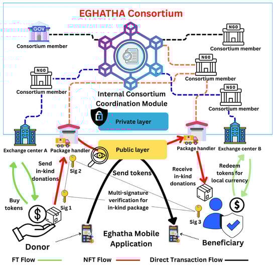 The blockchain-based platform operates on top of the Eghatha Blockchain through a dual-layer architecture. This layered approach aligns with recommendations for enhancing visibility and trust in humanitarian supply chains using blockchain technology []. At the backend, the system relies on smart contracts that form the logic core, ensuring automatic execution of predefined rules. Moreover, “Eghatha tokens” are used to exchange value between actors in the system. These tokens are of two types: (1) Eghatha Fungible Tokens (Eghatha FTs) are used for monetary contributions. (2) Eghatha Non-Fungible Tokens (Eghatha NFTs) represent in-kind donations. This tokenization strategy supports transparent and auditable donation flows, as demonstrated in blockchain-based charity frameworks [].