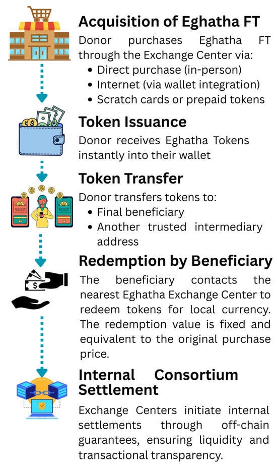 The donation process within the Eghatha Consortium starts when a donator contacts an authorized exchange center operated by an Eghatha consortium member to purchase digital relief tokens. Once the donor initiates the transaction, the process unfolds as follows: