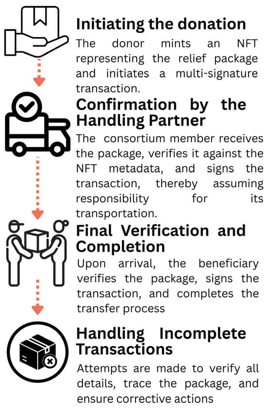 Seo et al. [] proposed a blockchain-based personal donation system that aimed to enhance transparency and encourage donations. The system addresses declining donation rates caused by trust and transparency issues in traditional platforms. It does so by examining factors that influence donation decisions and designing a consortium blockchain-based solution to ensure the transparent operation of donation-receiving groups. However, it lacks mechanisms for in-kind aid traceability. Khairuddin et al. [] investigated decentralized humanitarian logistics, underscoring blockchain’s potential to bridge communication gaps among relief actors.