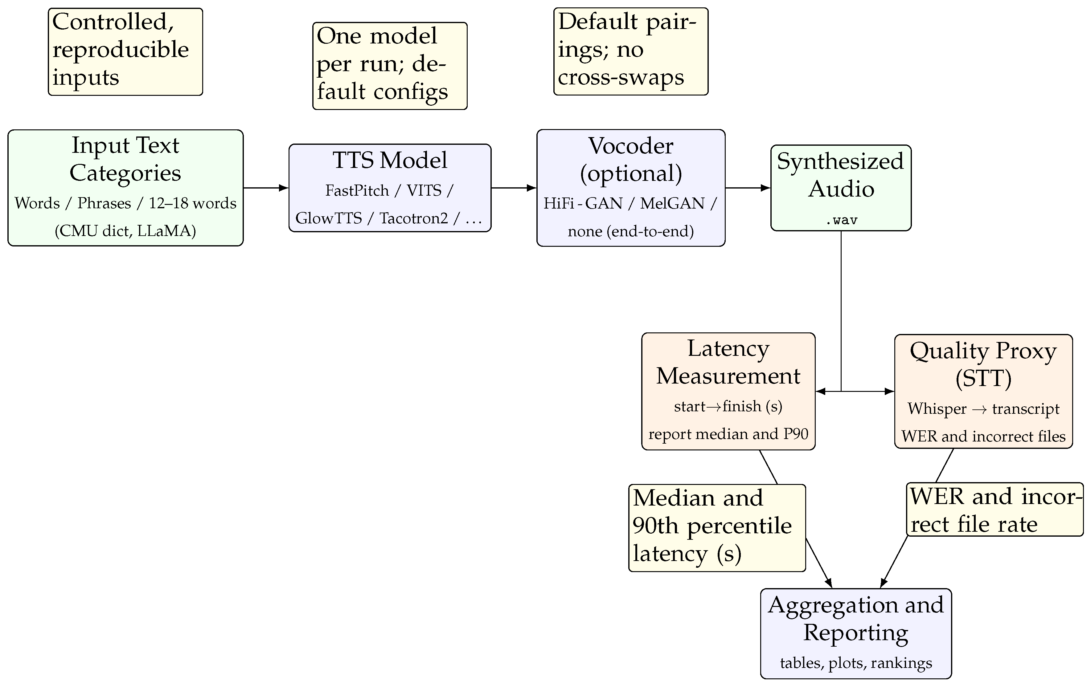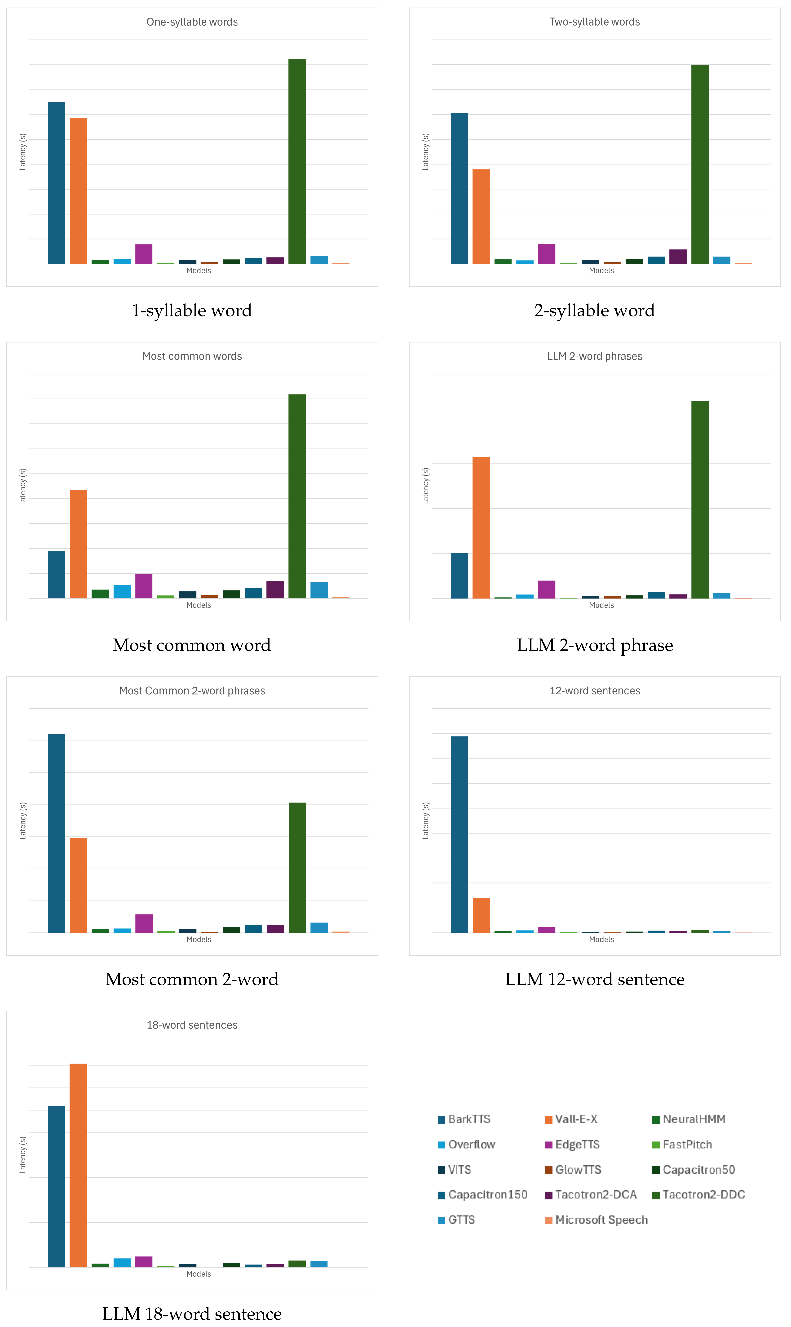 - Latency: This measures the time from when the model begins processing the text input to when the generated audio file is fully produced. This study reports the median latency, which summarizes typical synthesis speed across the dataset while minimizing the effect of outliers. Lower median latency directly indicates faster audio generation, which is critical for real-time voice assistant performance.