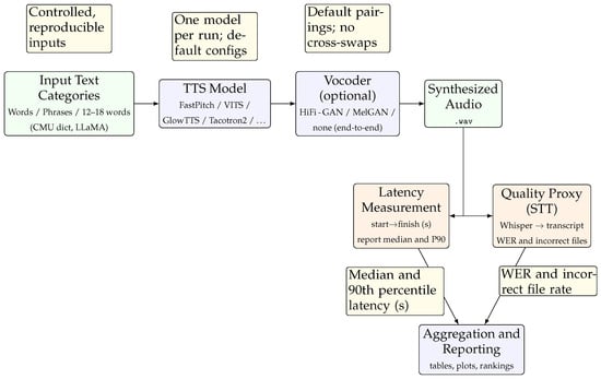 Picovoice (https://github.com/Picovoice/tts-latency-benchmark (accessed on 1 August 2025)) [] takes a different approach by focusing specifically on TTS inference speed. Their benchmark is lightweight and extensible, measuring latency at individual processing stages such as text preprocessing, model inference, and waveform generation. While this provides useful raw measurements of system components, the framework is limited in two key ways. First, it emphasizes speed in isolation, without incorporating quality assessment, which means models that produce unnatural or less intelligible speech may still appear favorable. Second, its scope is largely restricted to embedded or on-device scenarios, overlooking broader deployment settings. Most importantly, Picovoice reports raw timing breakdowns but does not synthesize them into representative indicators of user-perceived responsiveness. In contrast, our framework complements theirs by not only collecting latency data but also interpreting it through descriptive statistics—such as median latency and tail latency (P90)—that better capture typical and worst-case experiences of real-time interaction. Moreover, unlike Picovoice, we incorporate speech quality alongside latency, evaluating if models are not only fast but also intelligible and natural. Thus, while Picovoice demonstrates how latency can be measured at a granular level, our contribution advances this line of work by translating raw measurements into reproducible, user-centered benchmarks that integrate both responsiveness and quality, providing a more faithful representation of end-to-end performance in real-time virtual assistants.