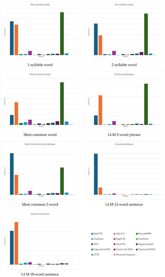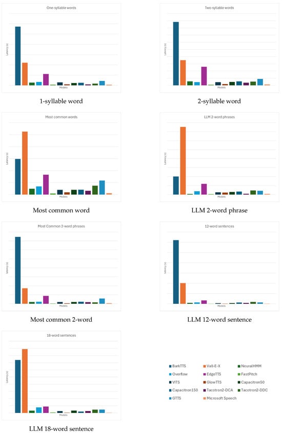 In addition to GTTS and EdgeTTS, prior reports on commercial APIs such as Amazon Polly and Google Cloud TTS help contextualize our findings. While official latency benchmarks are not published by these vendors, user measurements suggest that Amazon Polly can return speech in under 0.10 s for short inputs, whereas Google Cloud TTS responses typically average around 0.50 s, with occasional variability into the multi-second range (https://stackoverflow.com/questions/76709700/my-google-cloud-tts-speech-to-text-latency-almost-2-min (accessed on 1 August 2025)). Independent benchmarking by Artificial Analysis (https://artificialanalysis.ai/text-to-speech/model-family/aws#speed (accessed on 1 August 2025)) further highlights throughput differences across providers, reporting that Polly Neural voices sustain approx. 853 characters per second (corresponding to 0.06 s per 50-character phrase), while Google WaveNet achieves approx. 424 characters per second (0.12 s per 50-character phrase) (https://artificialanalysis.ai/ (accessed on 1 August 2025)). These observations reinforce that commercial platforms are heavily optimized for responsiveness, albeit subject to quota segmentation and usage costs, whereas our open-source benchmark emphasizes transparency and reproducibility even if absolute latencies are higher in some cases.