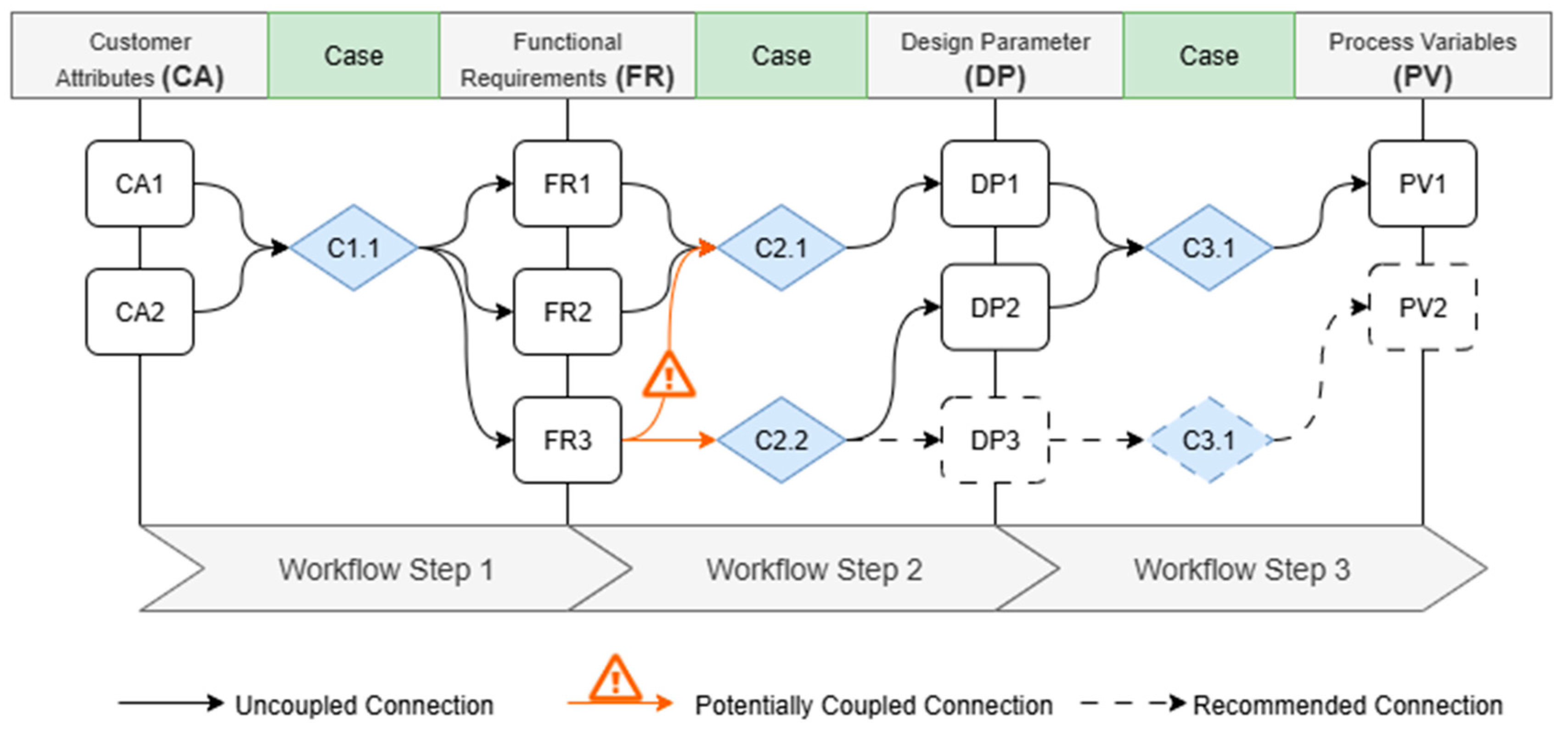 One design cycle involves three workflow steps, each integrating two domains that represent the AD structure. A case layer links the attributes within the individual domains. Each workflow displays only information relevant to the respective domains and the cases connecting them, helping the designer focus on the current task and avoid information overload. Zig-Zagging is implemented in the knowledge graph representation by connecting attributes with wires. When a new attribute is inserted into a domain (e.g., DP3), the user must connect it in two workflow steps (Step 2 and 3 in this example) to ensure an error-free dataset. Adding new attributes may also require new cases (C3.1) or additional attributes in different domains (such as PV2) to describe the design. If axiom 1 is violated, the affected connections are shown in the visualisation using colour and symbols (FR3 to C2.1 and C2.2). The application uses the second axiom (Information Axiom) to recommend solutions based on the information necessary to describe a solution. The number of DP used to address all FR within a single design can distinguish between solutions. The fewer DP attributes (or a combination of DP and Cases) in a workflow, the better the solution, according to the 2nd axiom. Minimising information content can begin with the selection of FR and the subsequent mapping of DP in a zig-zagging approach to meet all CA through a simplified design. The graphical representation helps to identify FR that are not connected to CA, thus pointing out unnecessary overhead in the conceptual design.