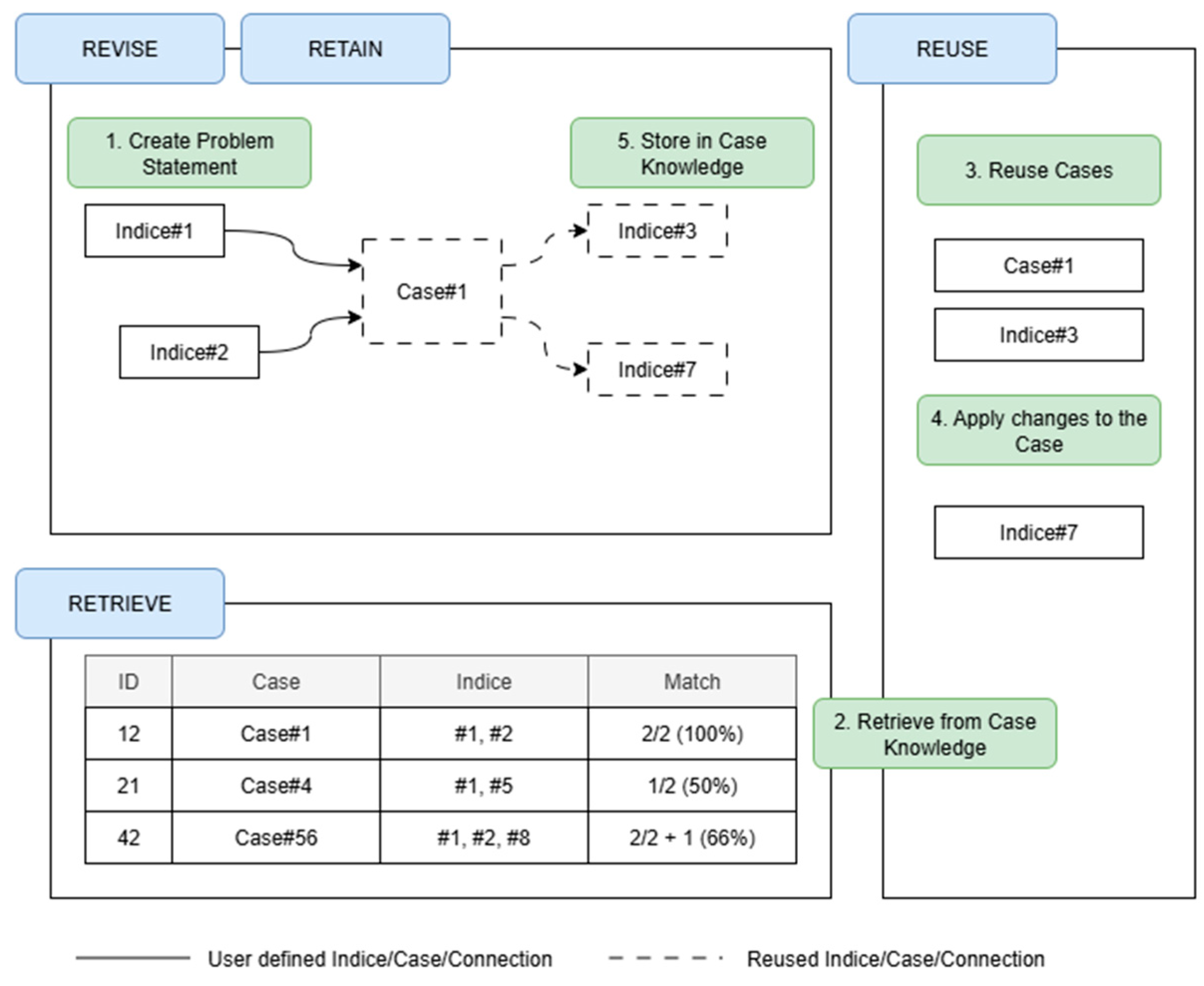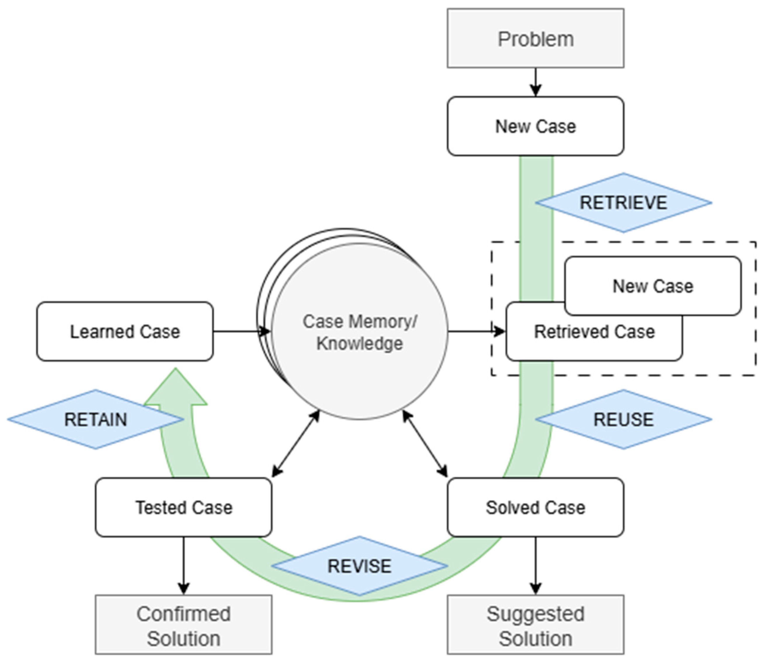 Retain: The new problem–solution pair is stored in the case database, supporting continuous system learning. Mechanisms are in place to manage the growth of the case base and prevent performance degradation.