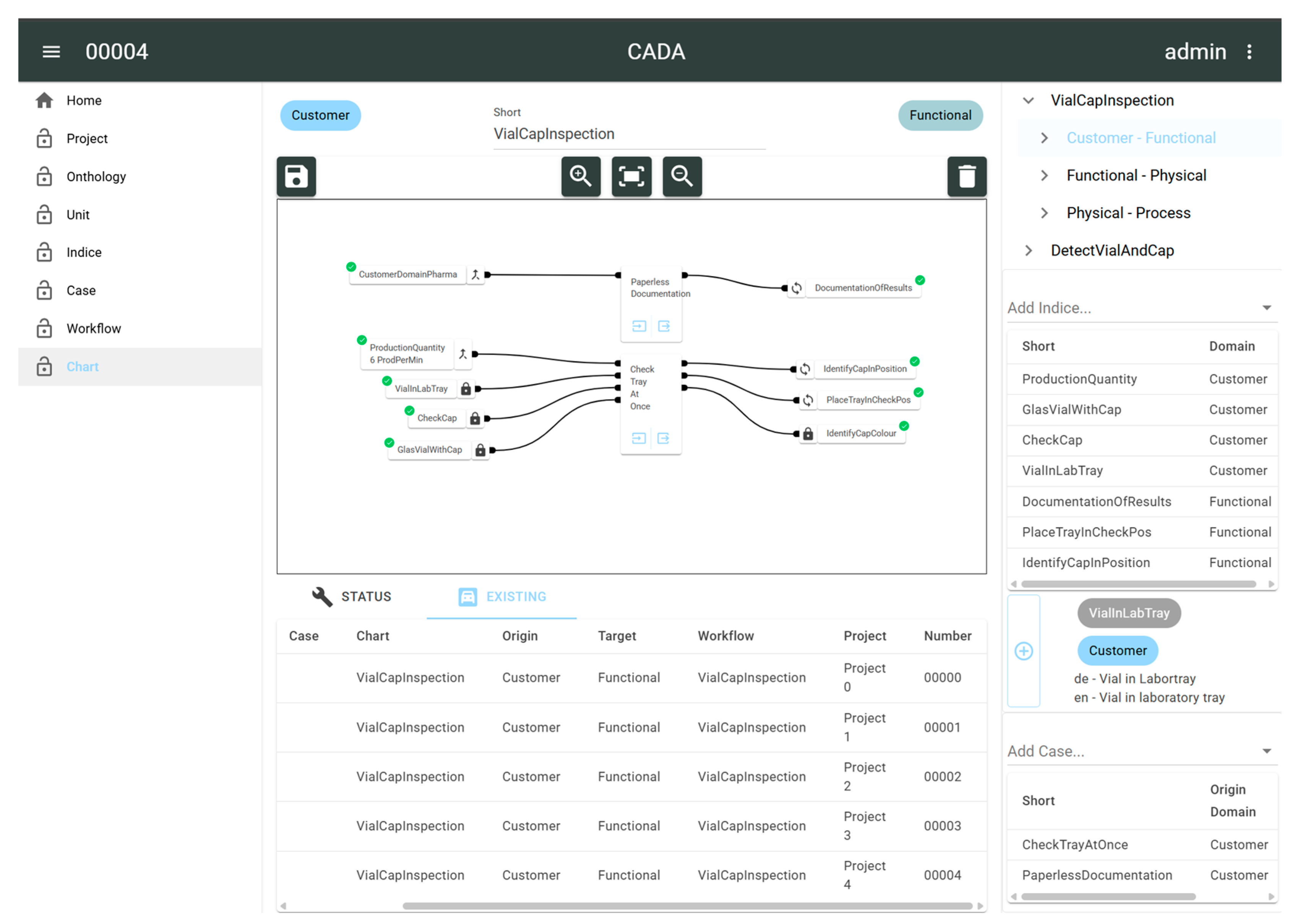 Figure 4). The entry point for the user software is a project in which a designer works on the tasks at hand. Within a project, various workflows are employed as a structured approach to problem-solving. Ideally (but not necessarily), a customer requirement can be processed by an isolated workflow (see 1st axiom—independence of requirements). Within a workflow, there are three charts, each containing two domains of the AD framework, which support the zig-zagging mechanism (targeted work between two domains to focus on the abstraction required in this step) from the AD procedure (Customer Attributes, Functional Requirements, Design Parameters, and Process Variables). Within a chart, there is a finite number of indices per domain, as well as the case modules that map the indices to one another. The connections between the nodes are generated by relations. The backbone of the case database is located in the ontology table. Here, the language elements used are collected and mapped to the individual data records. This results in a deep integration of the language elements into the individual components of the application. In addition to the language element itself, an extended translation can be attached. An index can be completed by a variable element consisting of a numerical value, a conversion factor and a unit. A comment function and a status symbol can extend the graphical elements of a chart. This serves the planned collaboration functionalities, which can be used to strengthen interactive work between different stakeholders.
