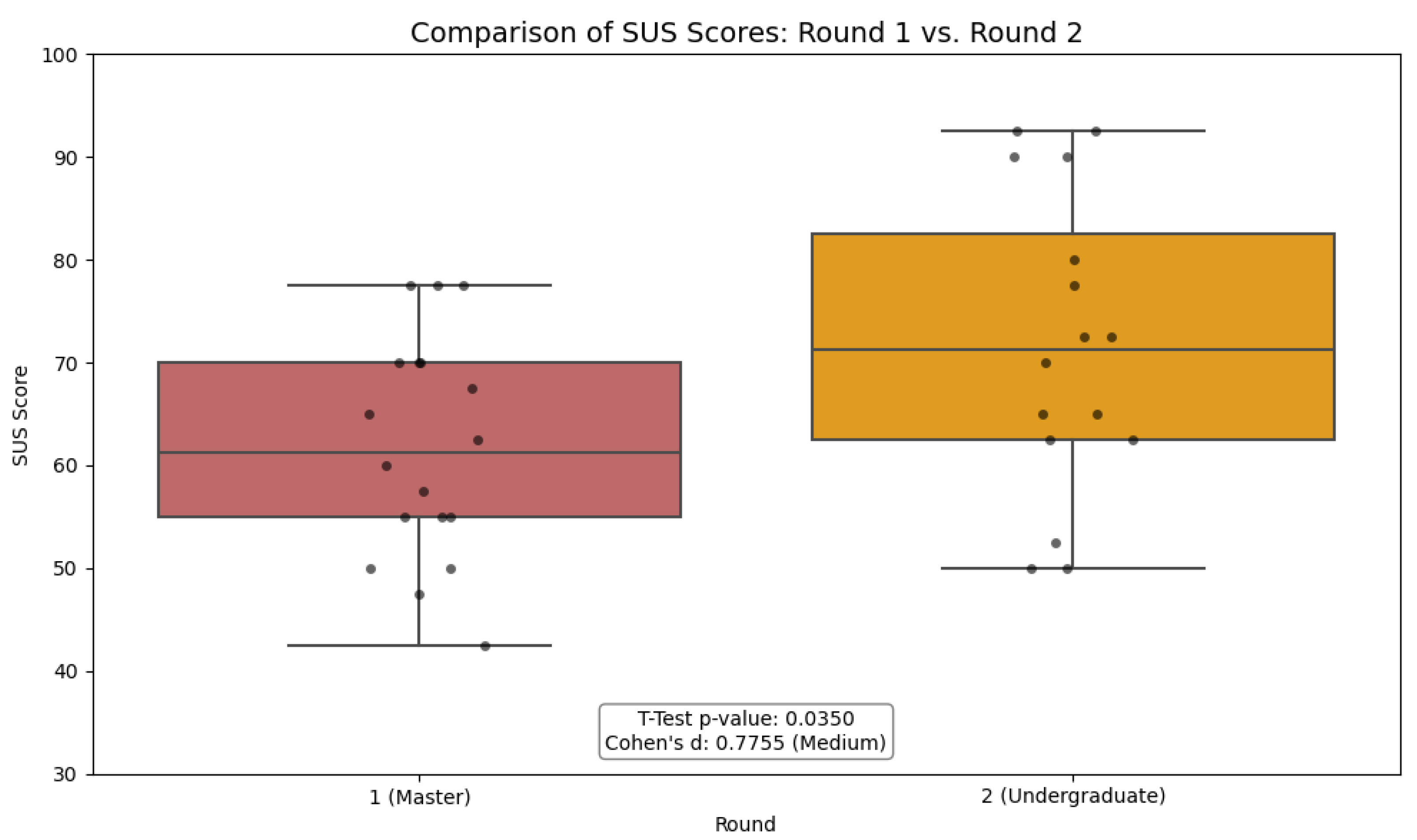 For RQ2, the average SUS score increased from 61.67 in the first round to 71.56 in the second round. To verify whether this difference was statistically significant, we conducted an independent sample t-test, resulting in a p-value of 0.035, which is below the 0.05 threshold. This indicates a statistically significant improvement in system usability. The effect size (Cohen’s ) suggests a medium-to-large effect. These findings imply that modifications such as improved documentation structure, clearer instructions, and interface enhancements contributed meaningfully to a more satisfactory and intuitive learning experience.