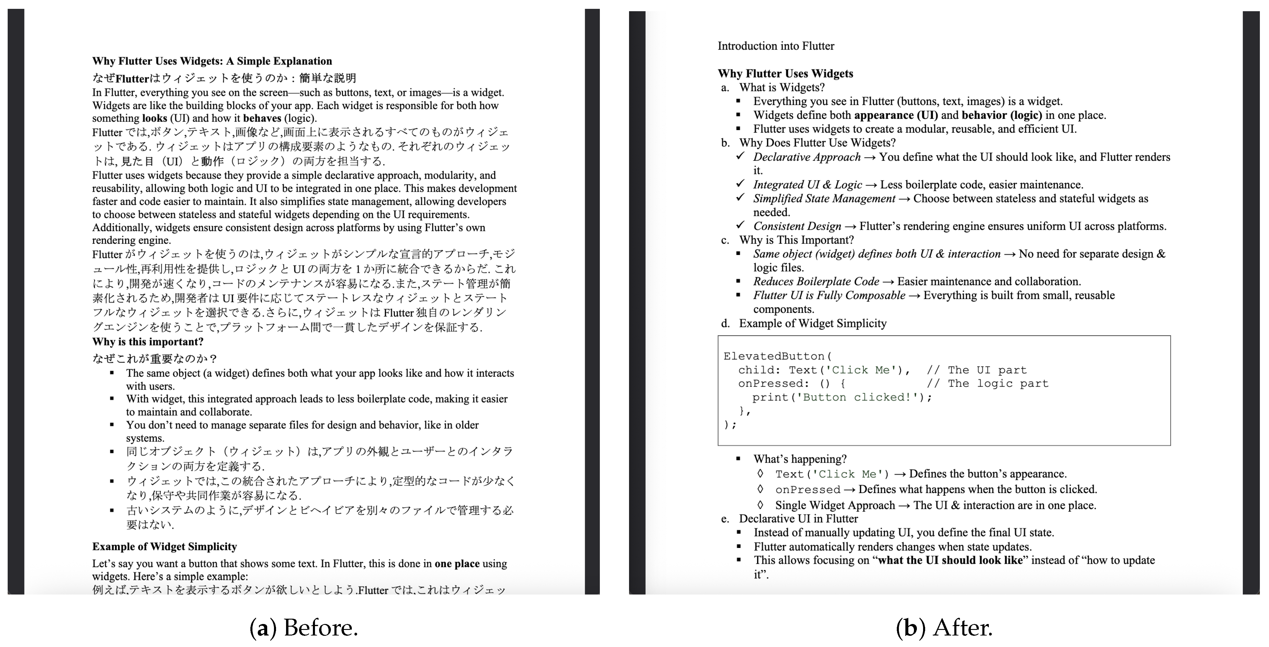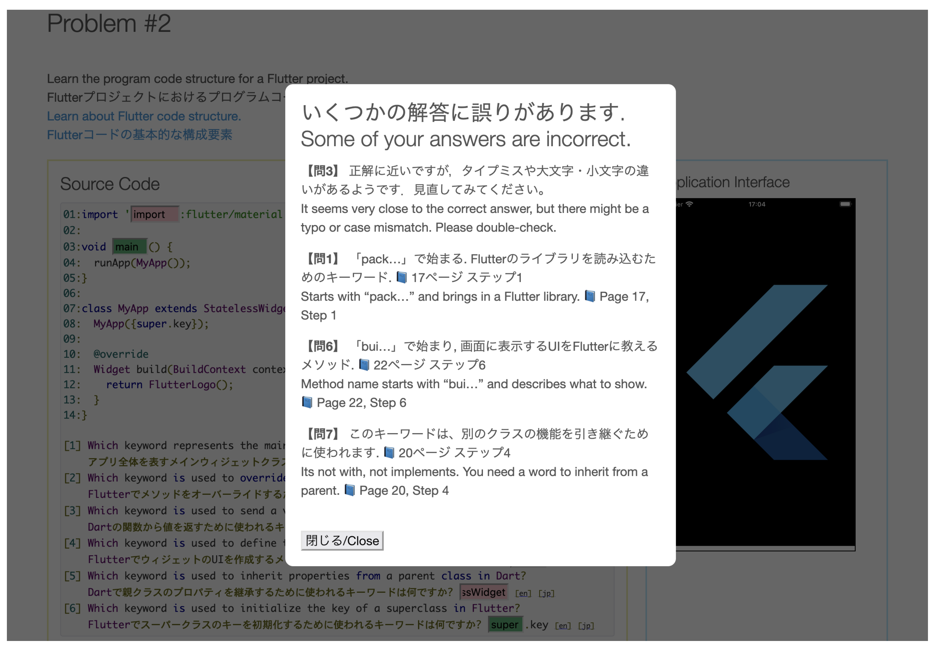 Second, we plan to enhance the system’s adaptability by incorporating features that respond to individual learning progress or error patterns. In addition, we will explore the development of a mobile application of the system using Flutter/Dart to promote greater accessibility and enable students to engage in Flutter/Dart learning at any time and any place.