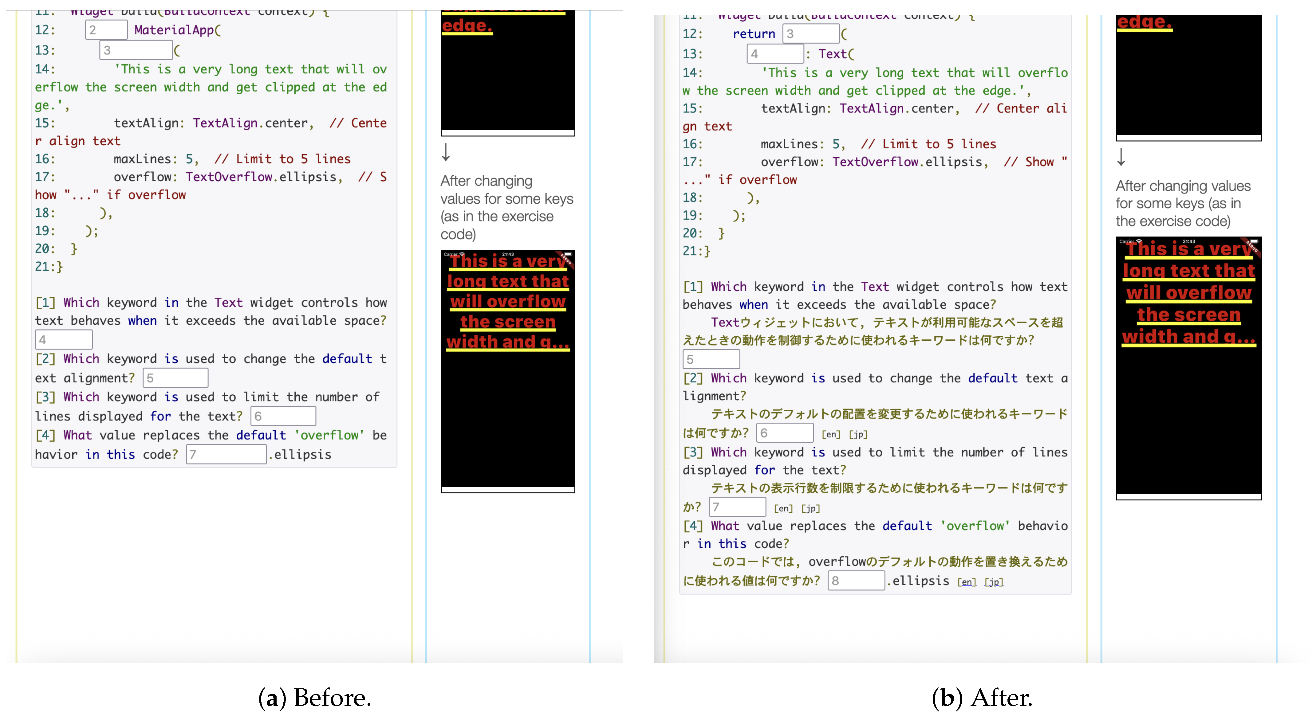 The combination of a source code, a visual output through a screenshot, and an interactive solving process implemented in the INT format have helped students connect the abstract syntax with the concrete interface behavior. This approach is particularly valuable when learning UI-focused frameworks such as Flutter. Furthermore, the grammar-focused learning design of GUP and the structured completion tasks of EFP proved effective in bridging the gap between students’ prior object-oriented programming (OOP) experiences and the Flutter’s declarative model.