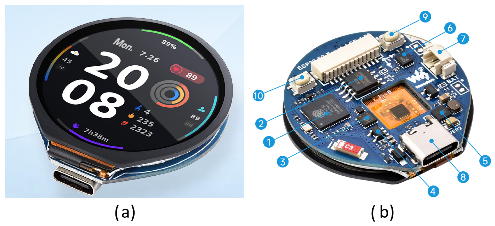 Figure 4b lists the internal and peripheral components (SoC, flash memory, regulator, charging chip, IMU, battery connector, USB-C port, and control buttons), which are explained below.