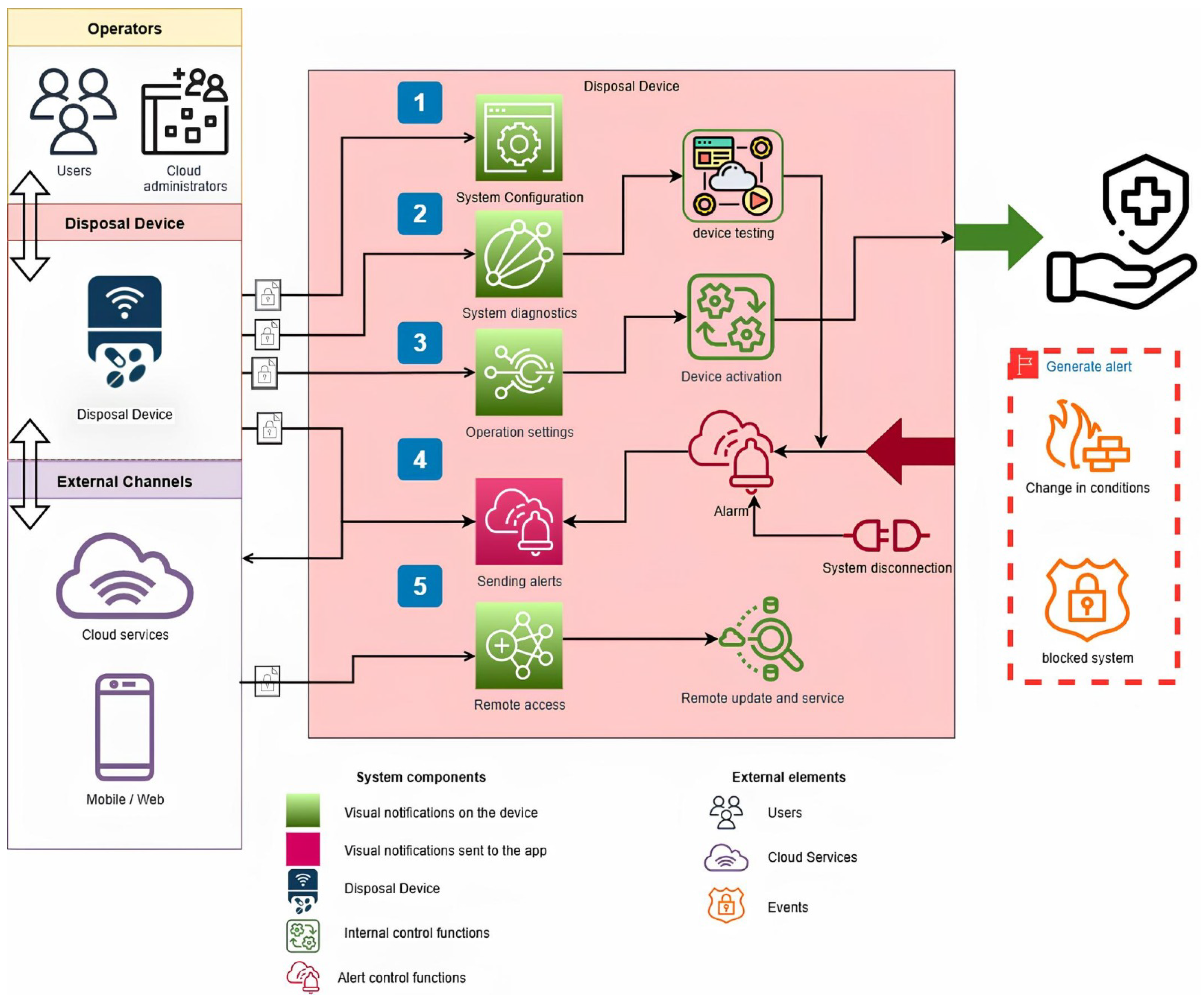 Stage 4: The system sends security alerts, which can be sent to the patient’s mobile phone or to a third party. The alerts are activated under normal reminder conditions and in critical situations, such as failure to take the dose, unauthorized openings, disconnections from the system (power line), or clogging problems. The alerts can also be sent to family members, caregivers, or medical staff.