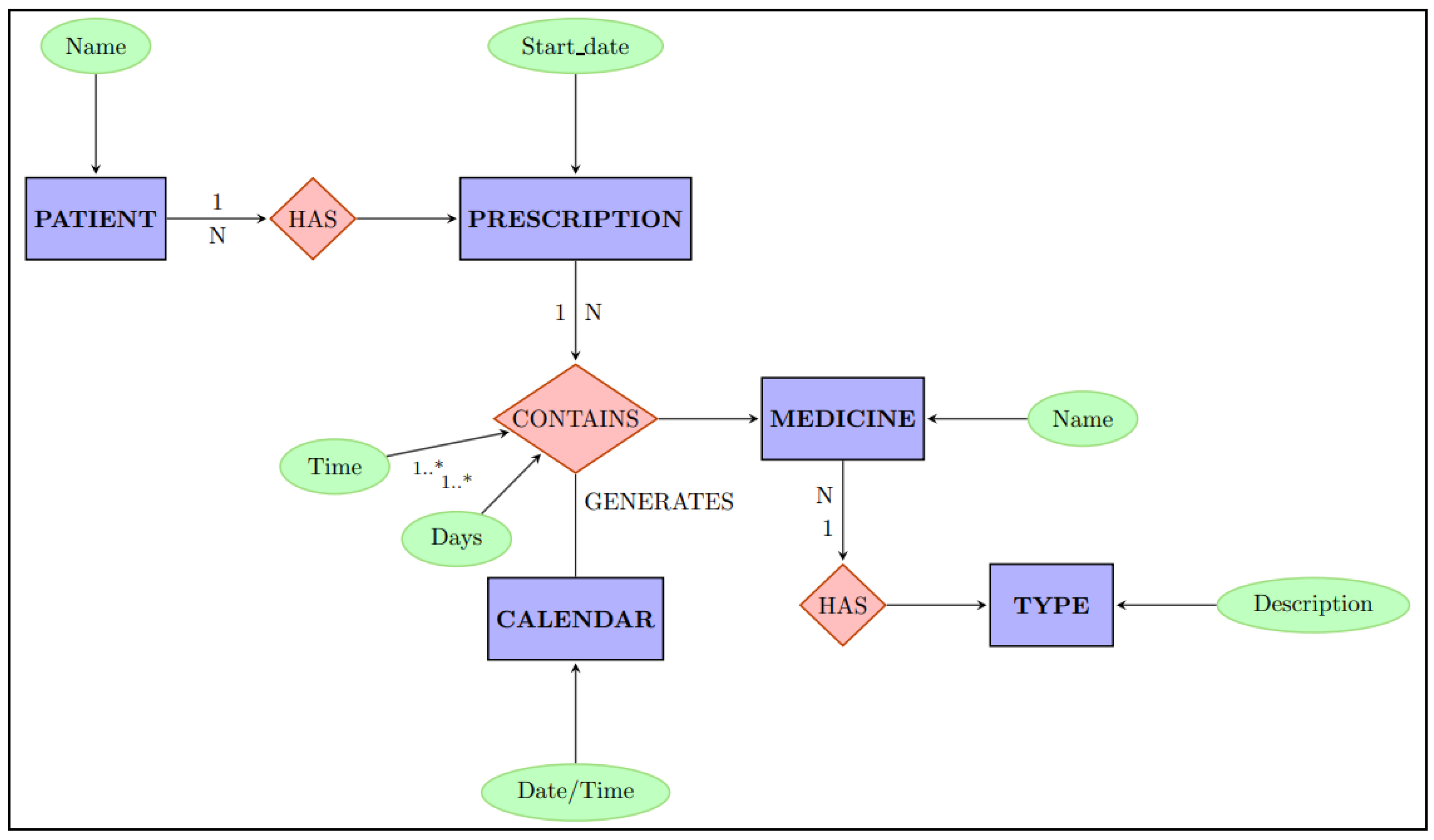 Figure 6 displays a section of the entity-relationship model that describes the relationship between a patient, their medical prescription, and the associated treatment. Each prescription contains the following: the prescribed medication, its type, and administration frequency. This frequency is implemented through a schedule specifying exact medication intake dates and times. The data serves as the information source for queries made by the smart pill box control module.