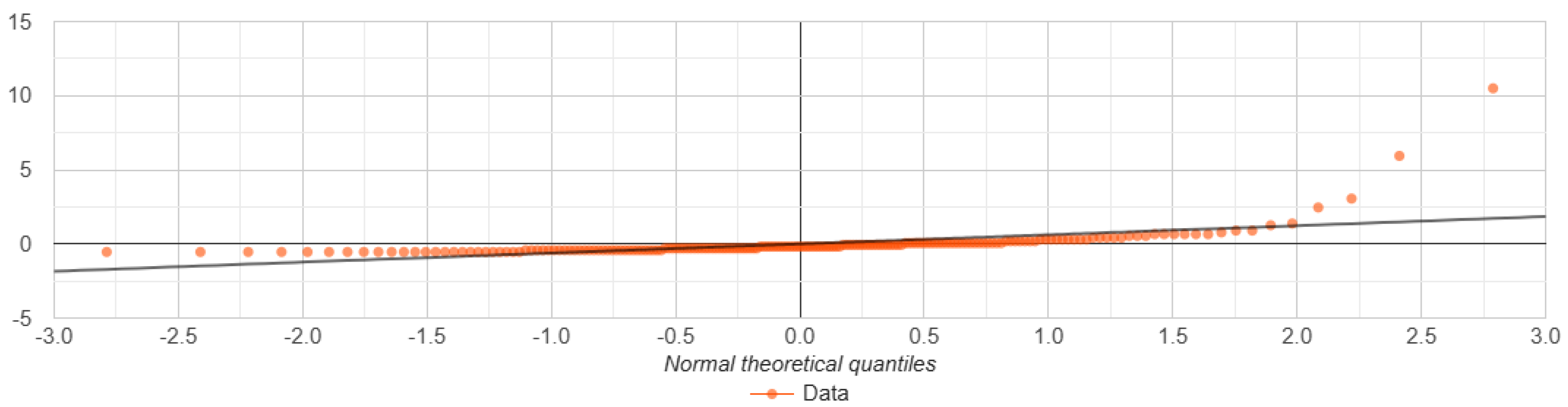 Figure 10, the quantile–quantile (QQ) plot is shown. As can be observed, the plotted points do not follow the straight line. The deviated points indicate a violation of the assumption of normality.