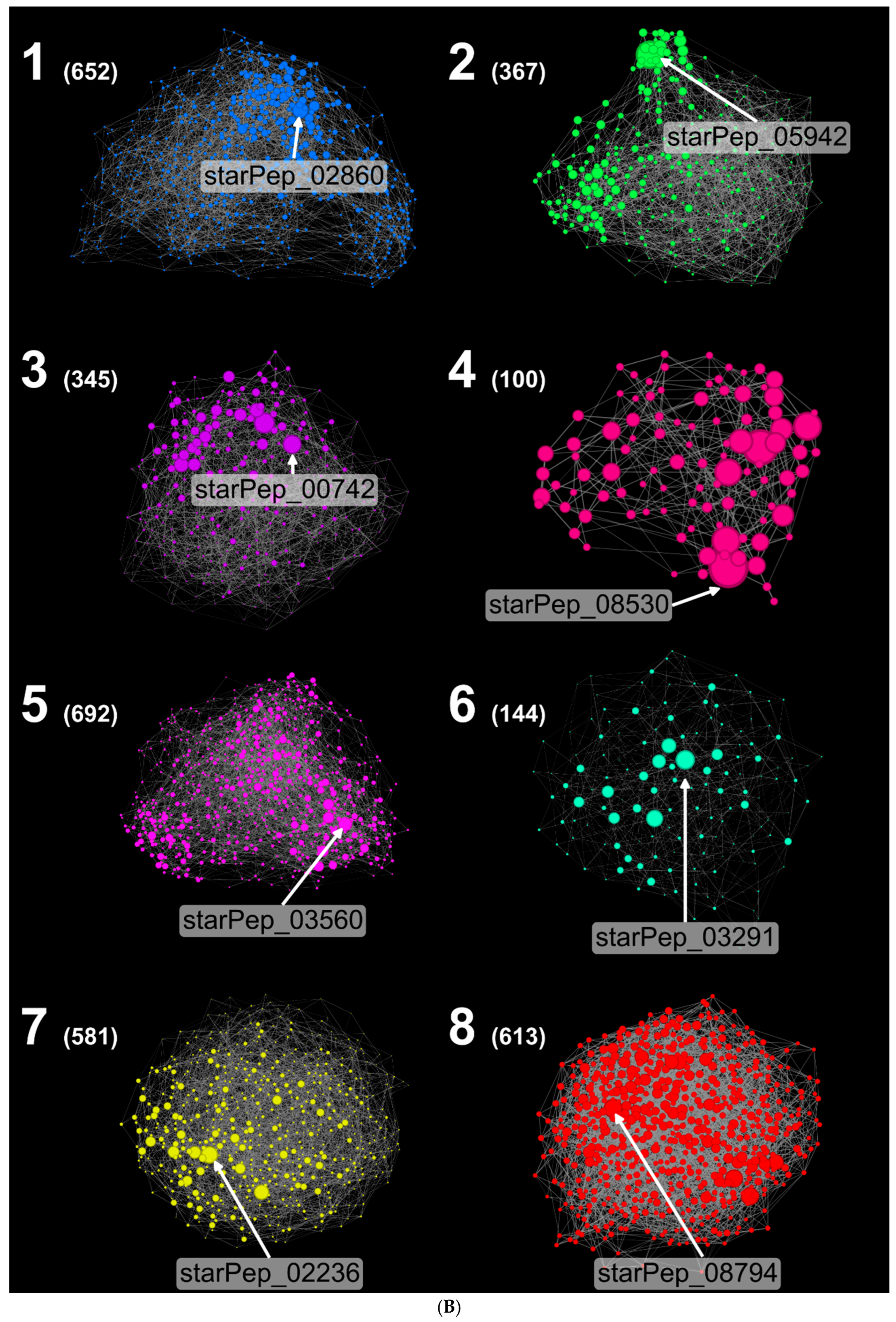 - StarPep_01372—Kenojeinin I from fermented skate skin; cationic residues aid bacterial membrane binding; hydrophobic residues disrupt membranes [78]. Seq: “GKQYFPKVGGRLSGKAPLAAKTHRRLKP”.