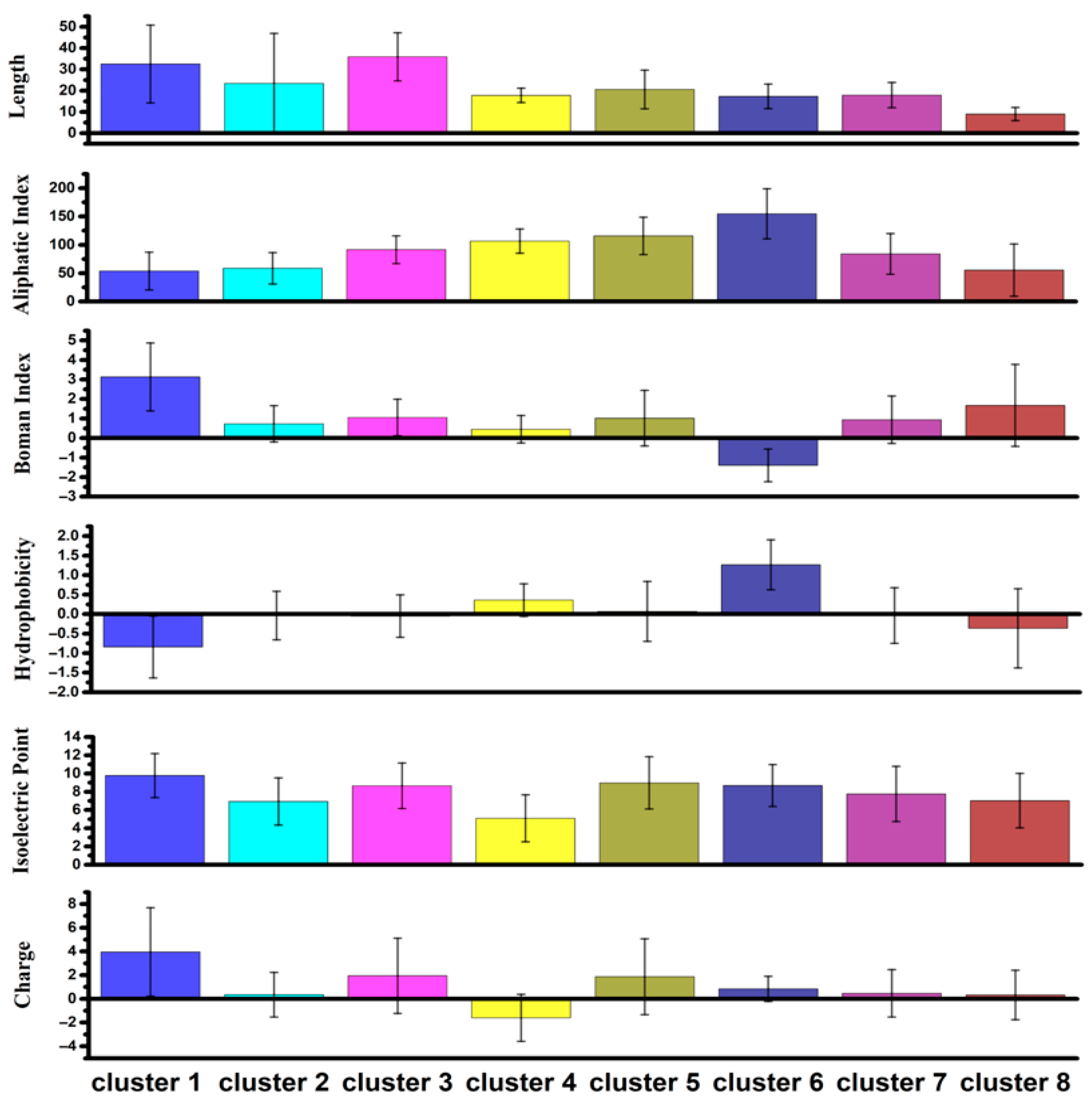 - Cluster 6: highest aliphatic index, high hydrophobicity, negative Boman index.