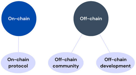 Recent studies conceptualize blockchain governance as a multi-layered system involving both technical and social components. A widely accepted distinction is that between on-chain governance, defined as formalized, software-encoded decision-making processes embedded directly into the protocol or smart contracts, and off-chain governance, which encompasses informal, human-led coordination such as developer discussions or community deliberation [21,22].