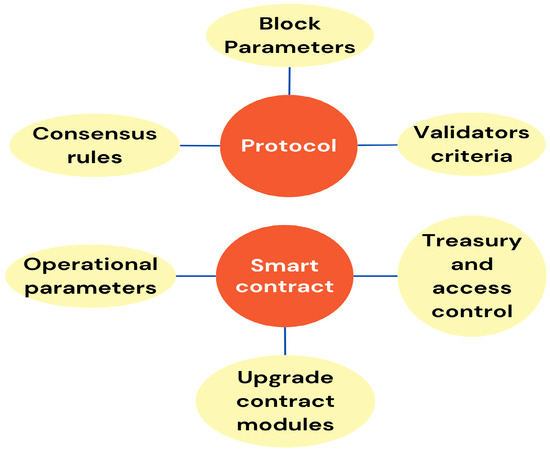 The technical location affected by a governance action often determines the nature and scope of its intended purpose, as it is highlighted in Figure 4. The protocol layer includes consensus rules, block production parameters, and validator selection criteria. Changes here typically require software updates by nodes or, in on-chain governance systems, are enacted through formal voting mechanisms embedded in the protocol [25,26]. In contrast, the smart contract layer governs decentralized applications (dApps) and DAOs: here, governance decisions alter operational parameters, upgrade contract modules, conflict resolution, or adjust treasury and access controls via smart-contract–based mechanisms [7,27,28].