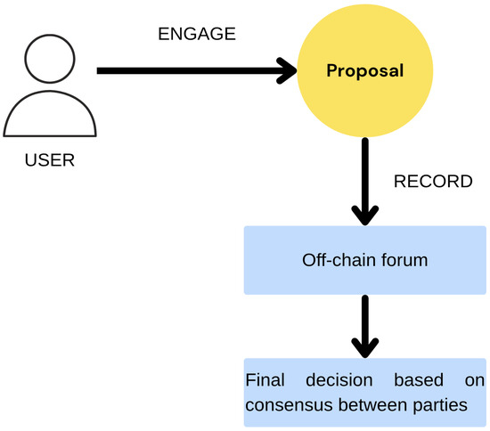 Off-chain governance refers to decision-making processes that occur outside the formal boundaries of the blockchain protocol. Rather than being codified at the protocol level, governance decisions are developed through informal mechanisms such as community discussions, developer coordination, social signaling, and consensus-building across different stakeholder groups (Figure 7). These interactions typically take place on forums, GitHub repositories, or social media [29,30,35,36].