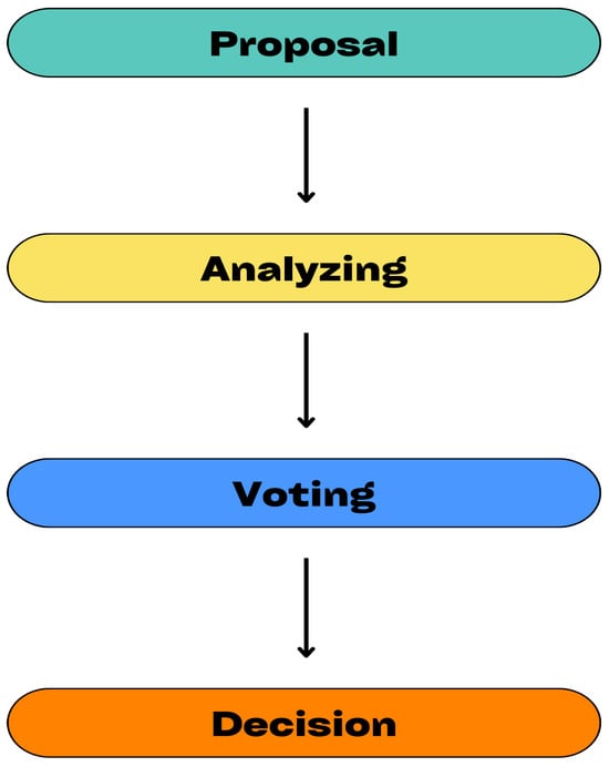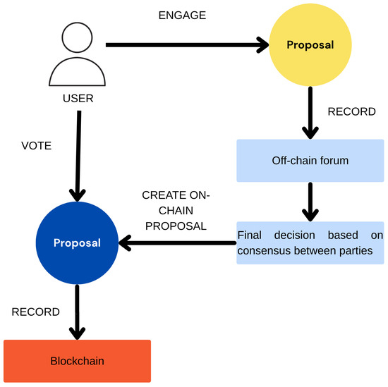 In on-chain governance, the rules and procedures for making changes are codified within the blockchain itself, allowing decisions to be executed automatically through smart contracts. Off-chain governance, by contrast, relies on informal structures, such as developer discussions, community forums, and social consensus, outside the blockchain’s technical layer. Hybrid governance attempts to integrate the strengths of both by combining formalized, automated voting with the flexibility of off-chain deliberation [30,31].