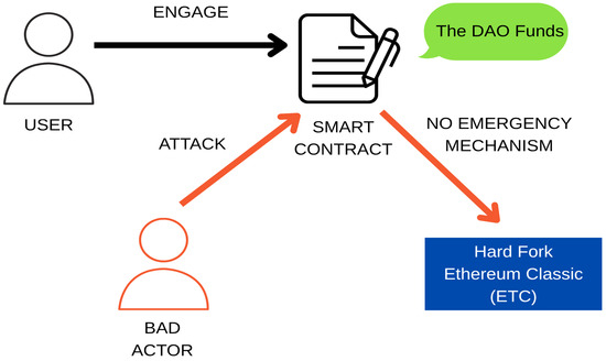 Shortly after launch, a flaw in the smart contract was exploited, enabling an attacker to redirect a substantial portion of funds in a way that, although technically permitted by the contract, clearly violated the community’s expectations (Figure 9). The Ethereum protocol itself lacked any built-in mechanism to halt or reverse such actions. This forced the community to coordinate off-chain, through discussions among developers, users, and miners, to deliberate a response. The resolution came in the form of a controversial hard fork, which effectively split the Ethereum blockchain into two networks [39,41,42].