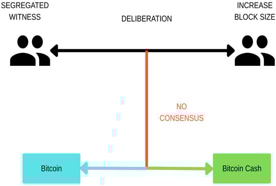 The split between Bitcoin and BCH in 2017 stands as a significant example of how the absence of a formal governance framework can lead to deep and irreversible fragmentation within a blockchain ecosystem. At the core of the disagreement was the question of how to scale Bitcoin to accommodate a growing number of transactions. As it is represented in Figure 11, one group advocated for increasing the block size limit, while others preferred implementing solutions like Segregated Witness [46,47,48].