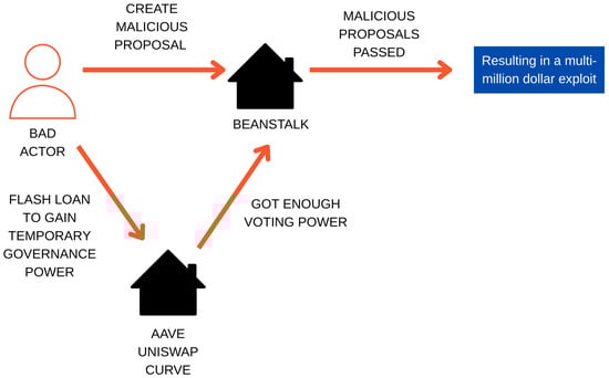 In April 2022, Beanstalk, a permissionless stablecoin protocol, suffered a severe governance exploit due to structural weaknesses in its on-chain voting system and insufficient execution delays. As it is highlighted in Figure 13, an attacker used a flash loan to temporarily acquire a supermajority of governance power via Liquidity Provider (LP) tokens and pushed through a malicious proposal. Using the emergencyCommit function, they executed the proposal and transferred a large portion of Beanstalk’s treasury to their own account [52,53,54].