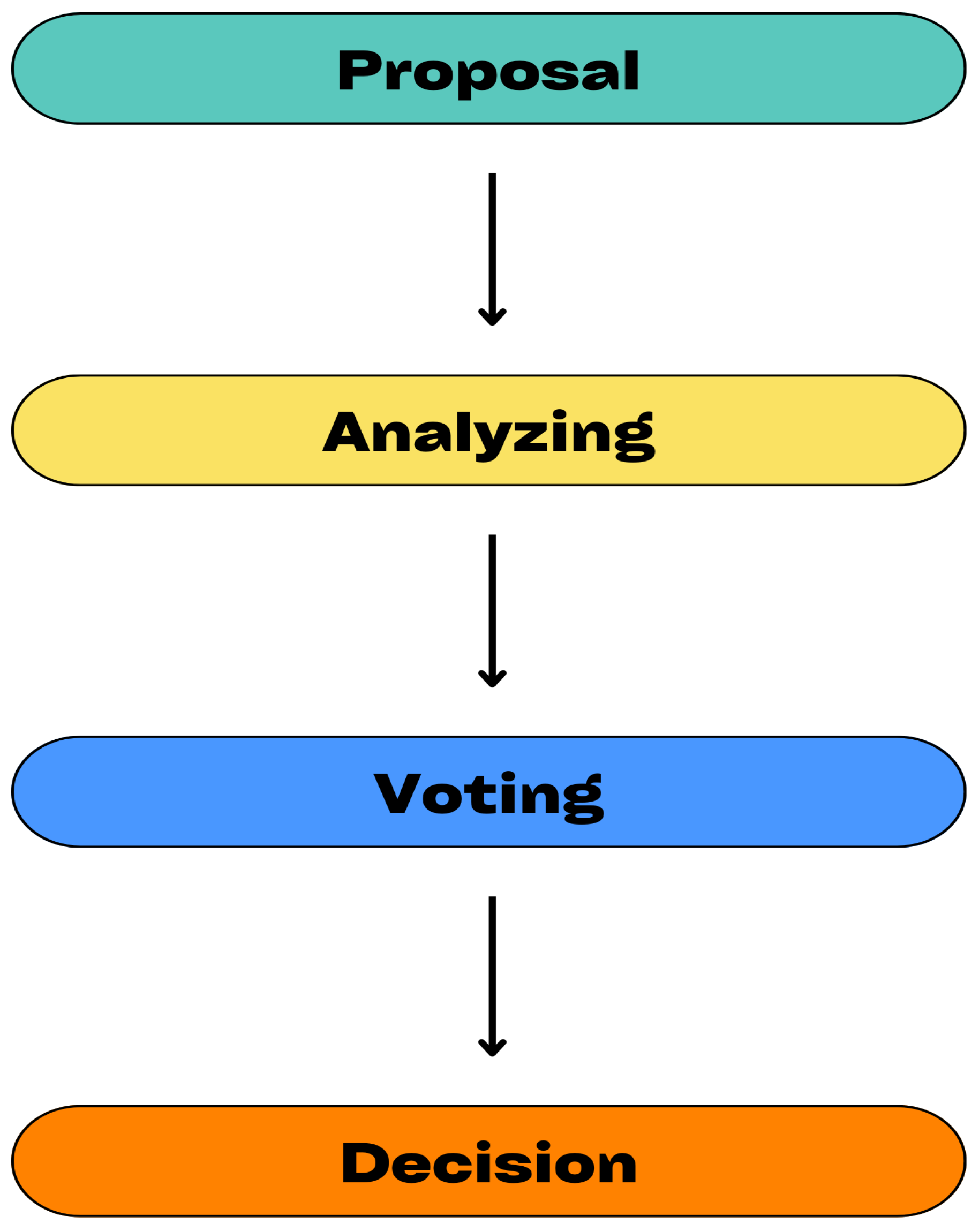 To make the framework more accessible, VOPPA can also be understood as a simple four-step cycle: proposals are first submitted; each predictive agent independently analyzes the proposal; agents cast individual votes; the results are aggregated into a collective decision. This high-level workflow is illustrated in