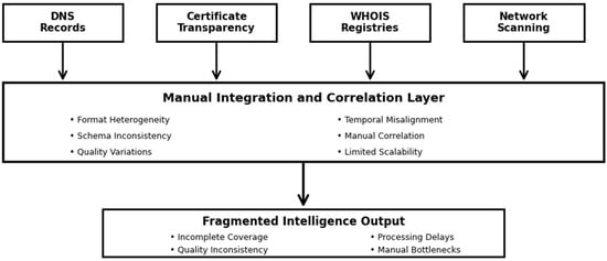 Integration complexity represents another significant obstacle to effective OSINT utilization. As demonstrated in Figure 1, current approaches require extensive manual effort to correlate information across heterogeneous data sources, each employing distinct schemas, formats, and update frequencies [17].
