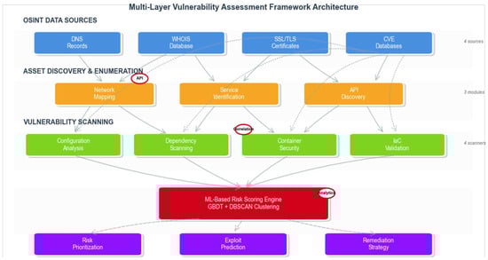 Multi-layered vulnerability assessment framework architecture showing integration points with OSINT data sources and ML-based risk scoring components.