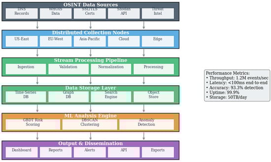 Modern automated reconnaissance systems have evolved from simple scripted scanners to sophisticated platforms incorporating distributed collection nodes, real-time processing pipelines, and adaptive intelligence generation capabilities. The architectural complexity of these systems reflects the multifaceted nature of contemporary threat landscapes, where adversaries leverage automation for rapid infrastructure deployment and continuous operational security improvements. Edwards et al. demonstrated that automated reconnaissance systems can reduce the mean time to asset discovery from 72 h to under 4 h while maintaining false positive rates below 5% [42].