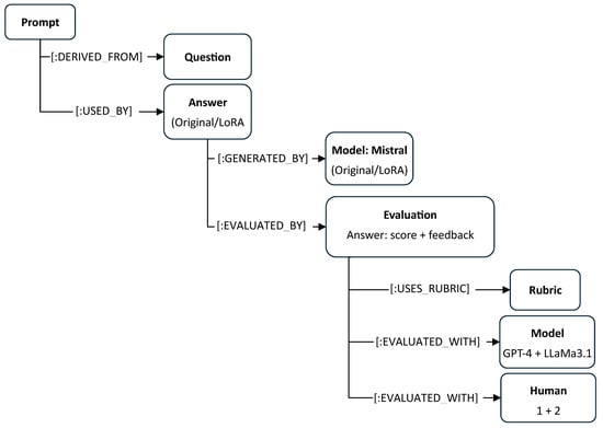 All artifacts—questions, prompts, answers, model identifiers, evaluation scores, feedback, and rubric metadata—were stored in a Neo4j graph database. The schema encoded entities as labeled nodes (Prompt, Answer, Model, Evaluation, Rubric) and their semantic relations via directed edges such as DERIVED_FROM, GENERATED_BY, EVALUATED_BY, USES_RUBRIC, and EVALUATED_WITH. Each evaluation node stores two sets of scores and feedback: one for the main answer and one for the accompanying explanation, enabling dual-layer analysis of content and justification quality. Neo4j has proven effective in representing educational knowledge graphs and supporting graph-based reasoning for automated evaluation tasks [