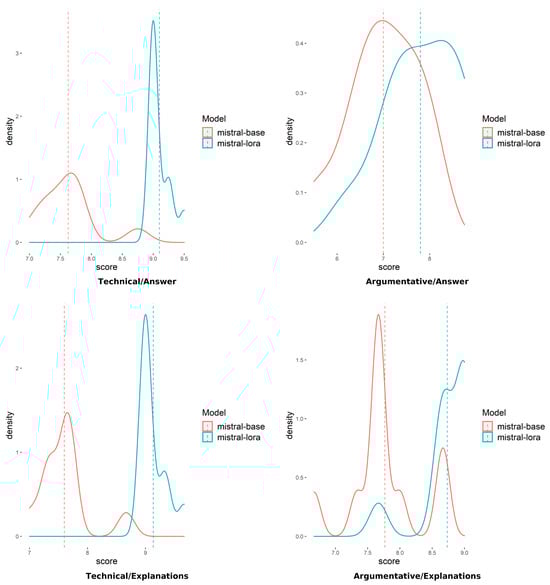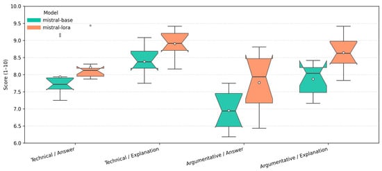 Table 3 presents detailed descriptive statistics for scores assigned to responses generated by the base model (mistral-base) and its fine-tuned counterpart (mistral-lora), across rubric types and evaluation components. The fine-tuned model consistently outperformed the base version in every condition. For argumentative tasks, the average answer score increased from 6.95 to 7.77, and explanation scores improved from 7.87 to 8.64. In technical tasks, the gains were also evident: answer scores rose from 7.94 to 8.21, while explanation scores increased from 8.38 to 8.91. These improvements were accompanied by smaller standard deviations and narrower 95% confidence intervals in technical tasks, while dispersion remained comparable on argumentative tasks, indicating enhanced scoring stability primarily in the technical setting. The results indicate that domain-specific fine-tuning improves the quality and consistency of model outputs, with gains concentrated in technical settings and consistent improvements for explanations.