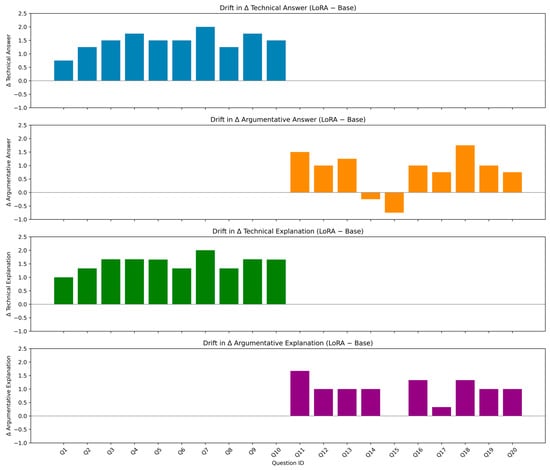 Overall, the per-question drift analysis reveals a clear asymmetry in the effectiveness of fine-tuning: technical tasks benefit the most—both at the level of answer generation and explanation—while argumentative tasks, though improved, remain more sensitive to prompt framing and rubric abstraction. These findings reinforce the pedagogical value of rubric-guided adaptation and highlight areas where targeted refinements may further enhance consistency in open-ended assessment contexts.