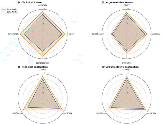 To further examine how fine-tuning affected alignment with specific evaluation criteria, we disaggregated the judge-assigned scores across four rubric-defined categories: Technical Answer, Argumentative Answer, Technical Explanation, and Argumentative Explanation. For each of these, we computed the average score assigned to each individual rubric dimension, comparing the base and fine-tuned model outputs. This rubric-level analysis enabled a fine-grained understanding of where model adaptation had the strongest impact, and which cognitive or rhetorical dimensions were most improved through supervised instruction. No inferential testing is performed in this subsection; results are descriptive diagnostics.