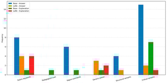 Figure 7. The figure displays the frequency with which each semantic category was triggered during evaluation, separated by model (mistral-base vs. mistral-lora) and component (Answer vs. Explanation). This visualization highlights the relative prevalence of rubric-aligned language, critical remarks, vague expressions, and generic praise, enabling a comparative perspective on the evaluative discourse elicited by each model variant.