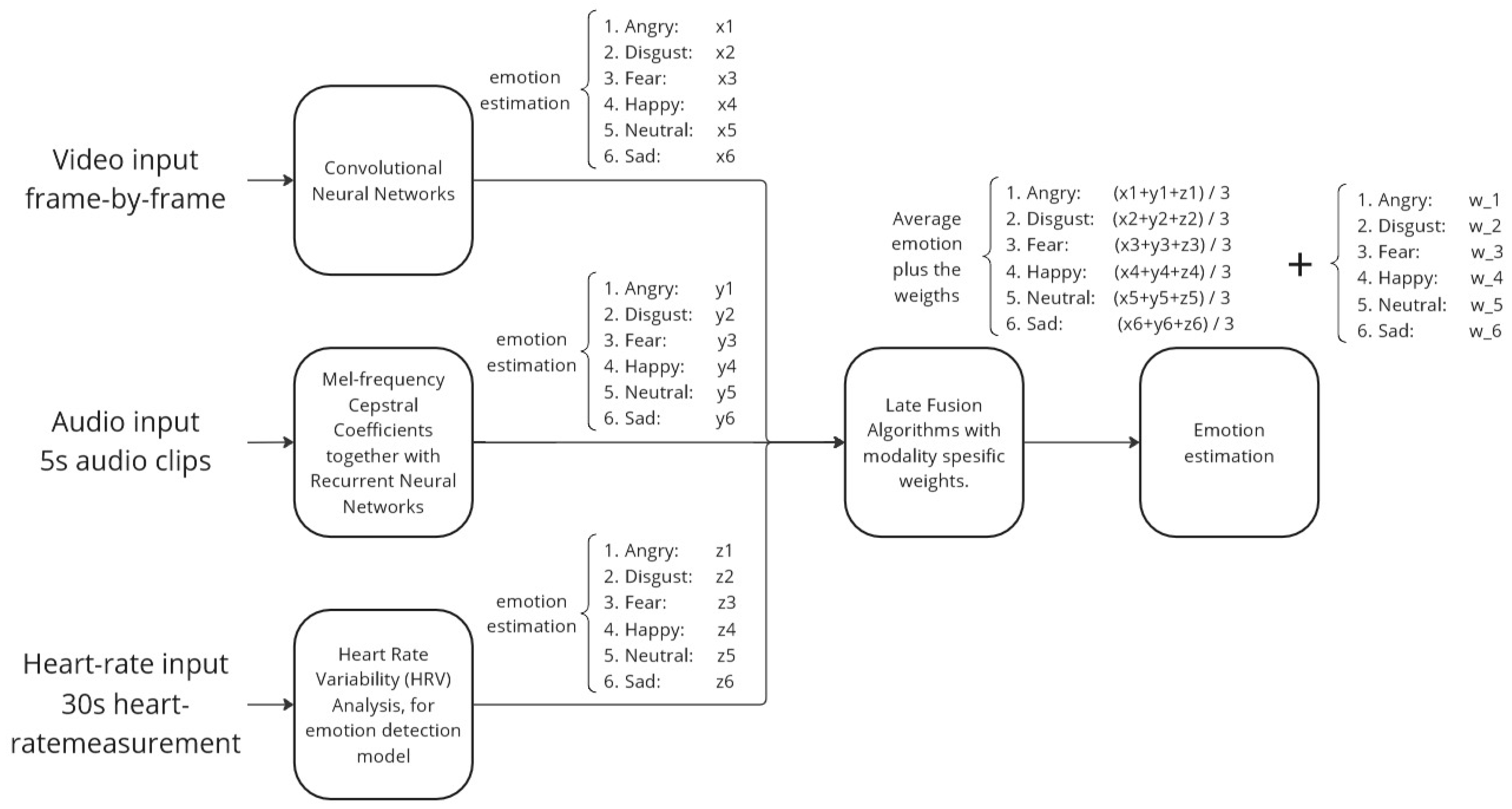 The fusion stage computes preliminary emotion scores by averaging the outputs from all three modalities for each emotion category, then applies a late fusion algorithm with modality-specific weights to account for the varying reliability of each modality for different emotions. This weighted fusion approach enables the system to leverage the complementary strengths of each modality while compensating for individual weaknesses.