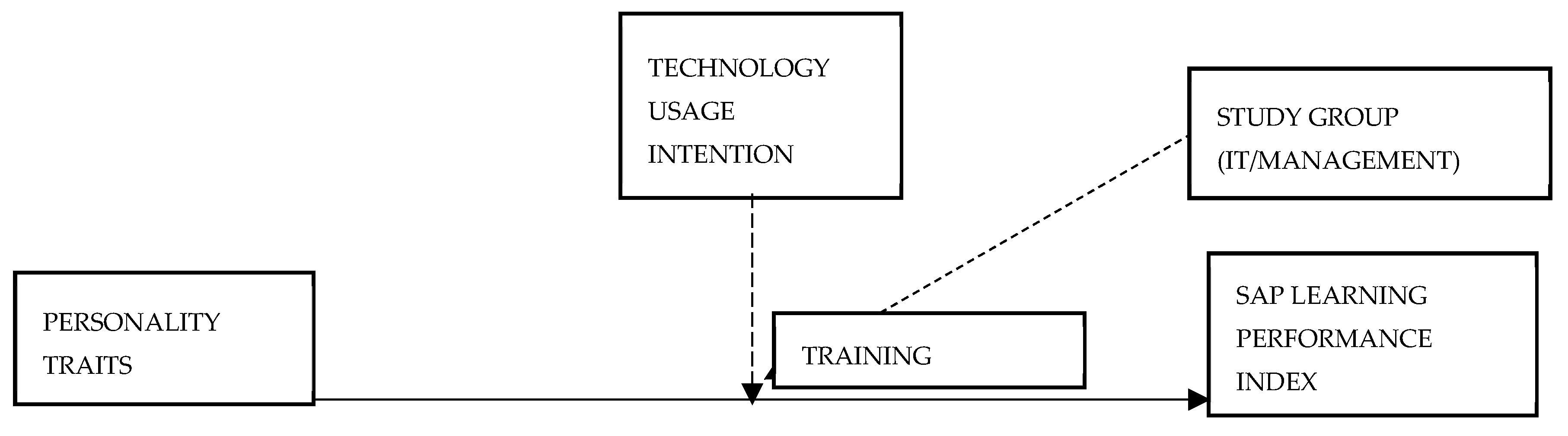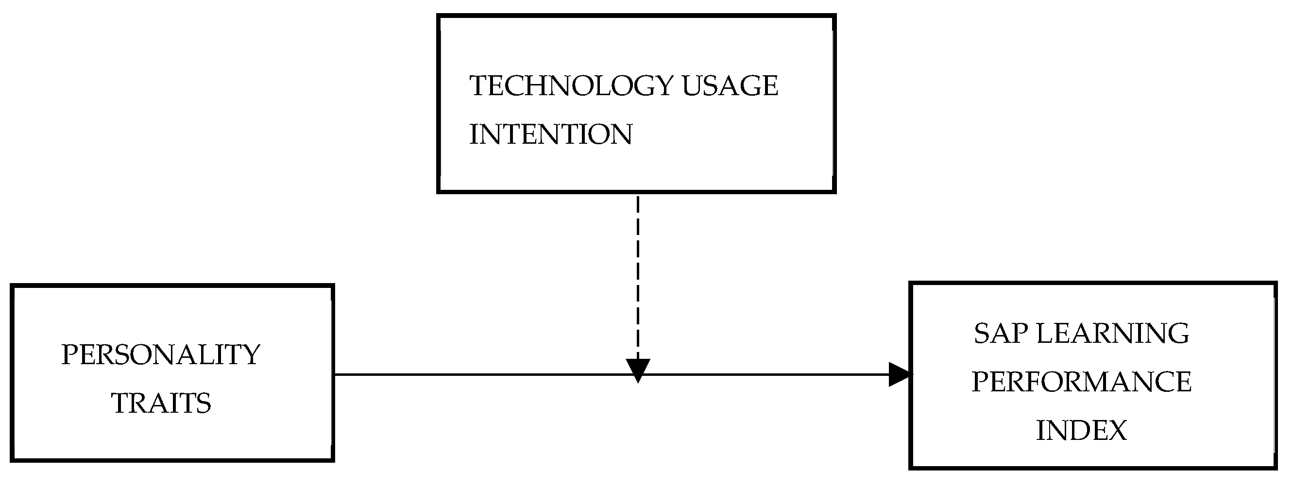 Building on the previously discussed findings regarding the relationship between personality traits and academic success [31,32,33,34,35,36,37,41,42,43,44,45,46,47,48,49,50,51,52,53], it is reasonable to assume that similar patterns may emerge in situations involving the adoption of new technologies such as SAP/ERP.