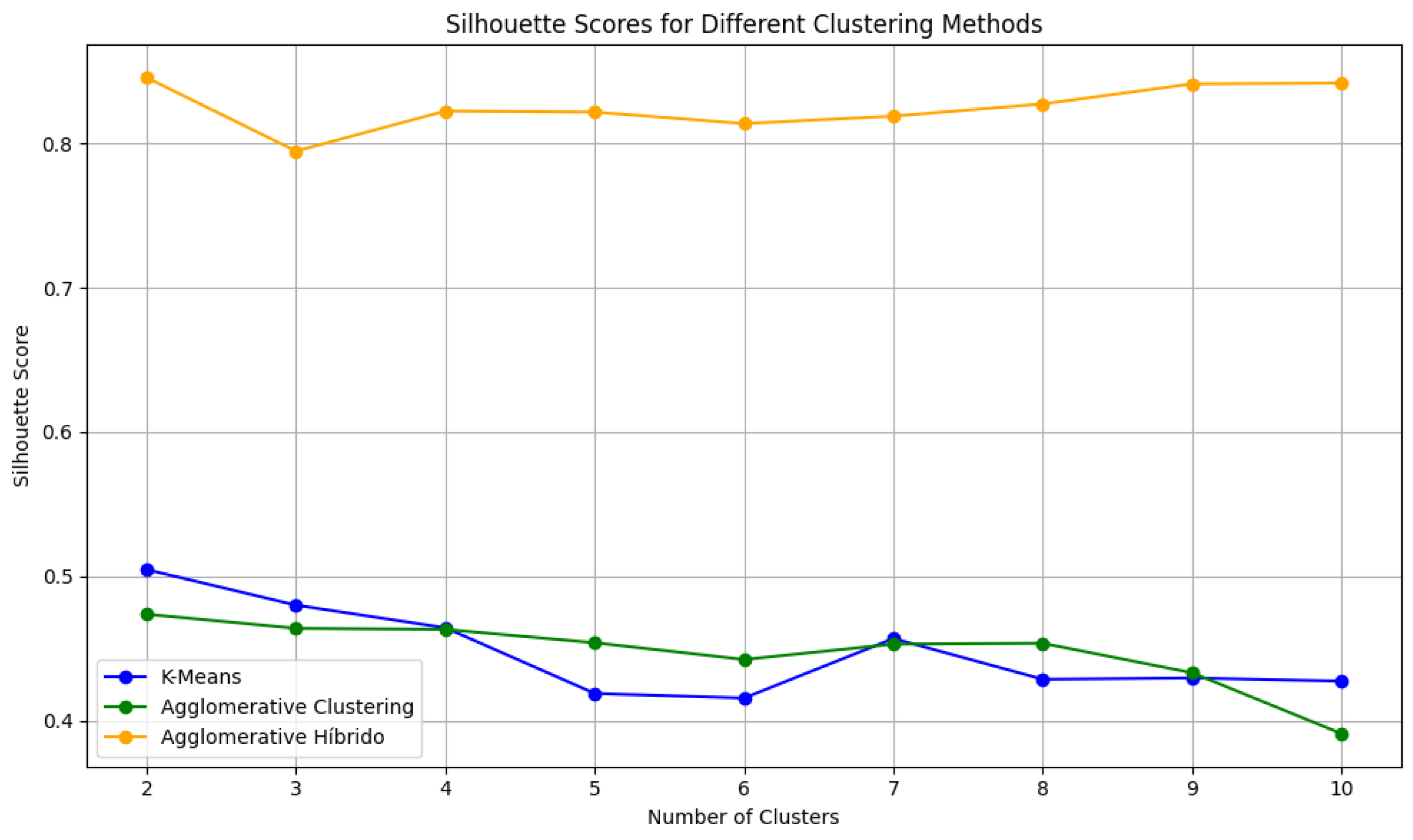 Figure 2 presents the silhouette scores for each method across a range of cluster numbers.