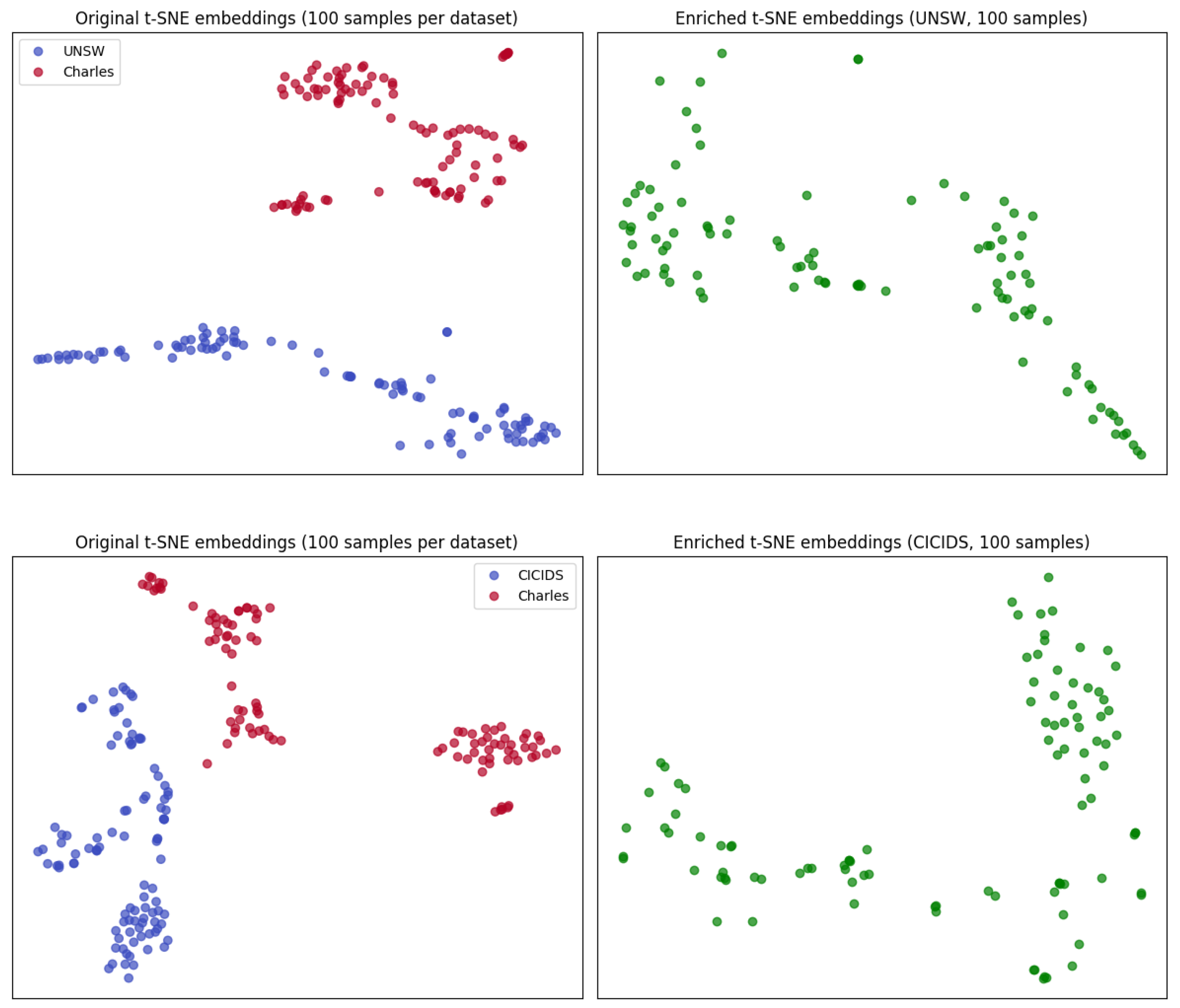 58]. t-SNE projects high-dimensional representations into two dimensions while preserving local neighborhood structure, making cluster formation, overlap, and domain separation visually apparent. This visualization allows us to (i) verify the domain separation achieved by the adversarial alignment between network traffic datasets (UNSW-NB15 and CIC-IDS-2017) and Charles behavioral dat and (ii) inspect how the enrichment modifies the geometry of network embeddings by tightening normal patterns and exposing finer-grained anomalous structures. In other words, the plots provide an intuitive view of how behavioral context changes the arrangement of samples in the latent space, clarifying the mechanism by which the enriched features improve separability for downstream anomaly detection.