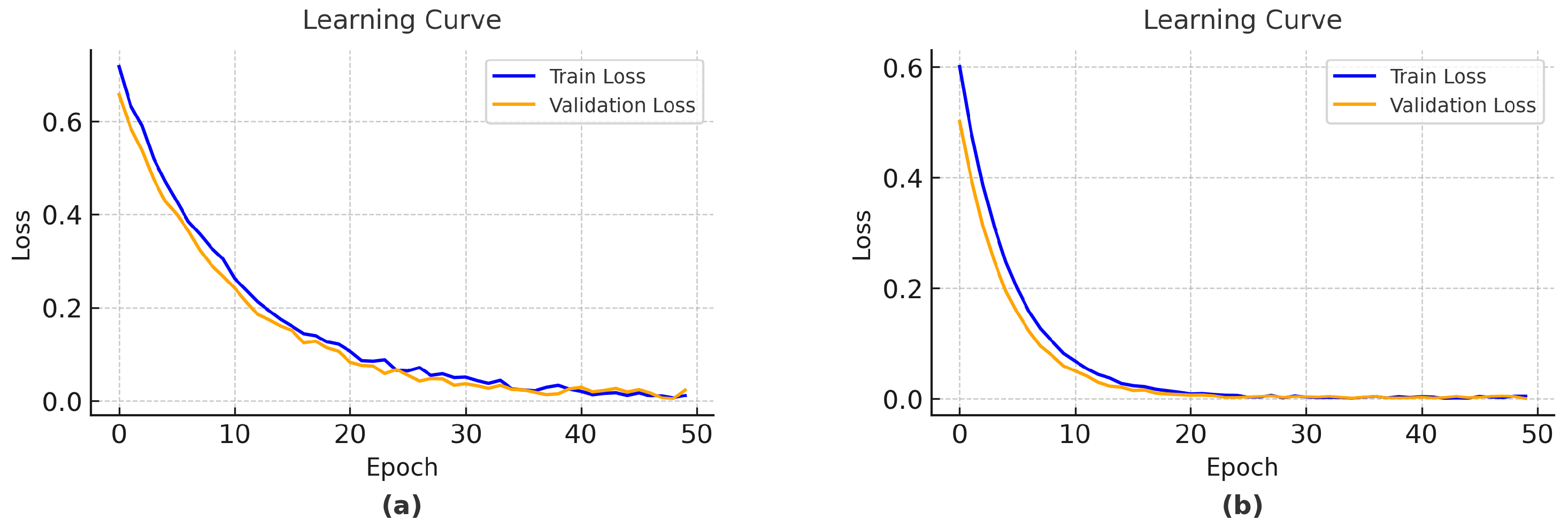 Figure 4b) exhibits rapid convergence within the first 10 epochs. Both training and validation losses drop from initial values of 0.6 and 0.47, respectively, to near-zero values by epoch 6. The losses remain at approximately 0.001 for the remaining training period, creating parallel trajectories with minimal separation.