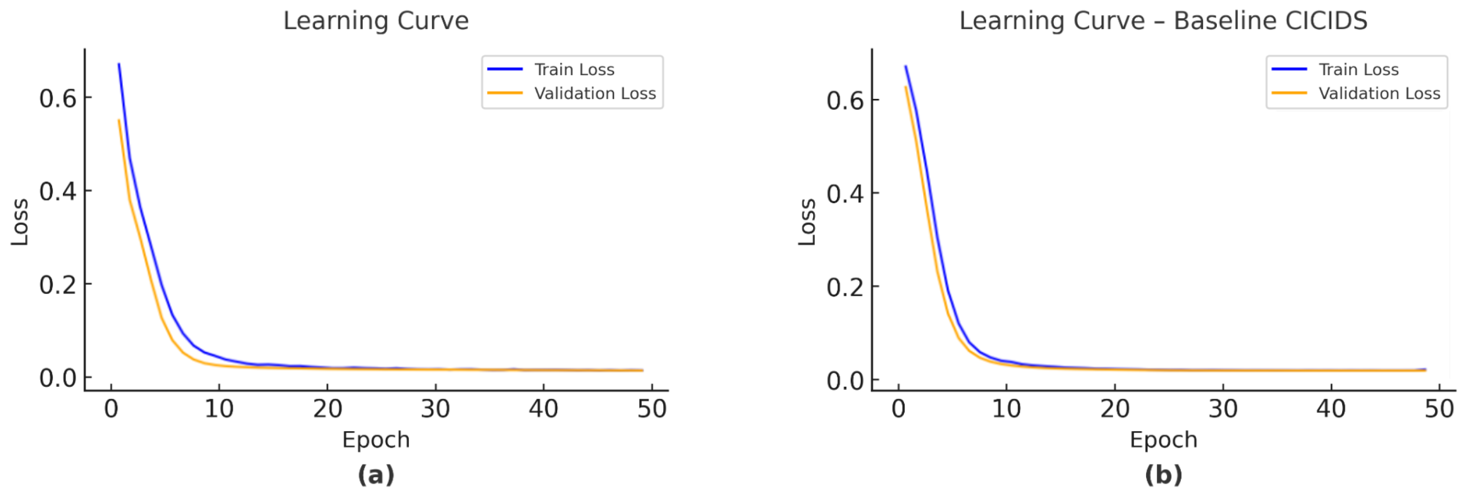 Figure 6b) exhibits rapid convergence comparable to the UNSW-NB15 baseline, with both training and validation losses dropping sharply in the initial epochs and stabilizing at near-zero values. This pattern mirrors the behavior observed in the UNSW-NB15 baseline, suggesting consistent overfitting characteristics across datasets when behavioral enrichment is absent.