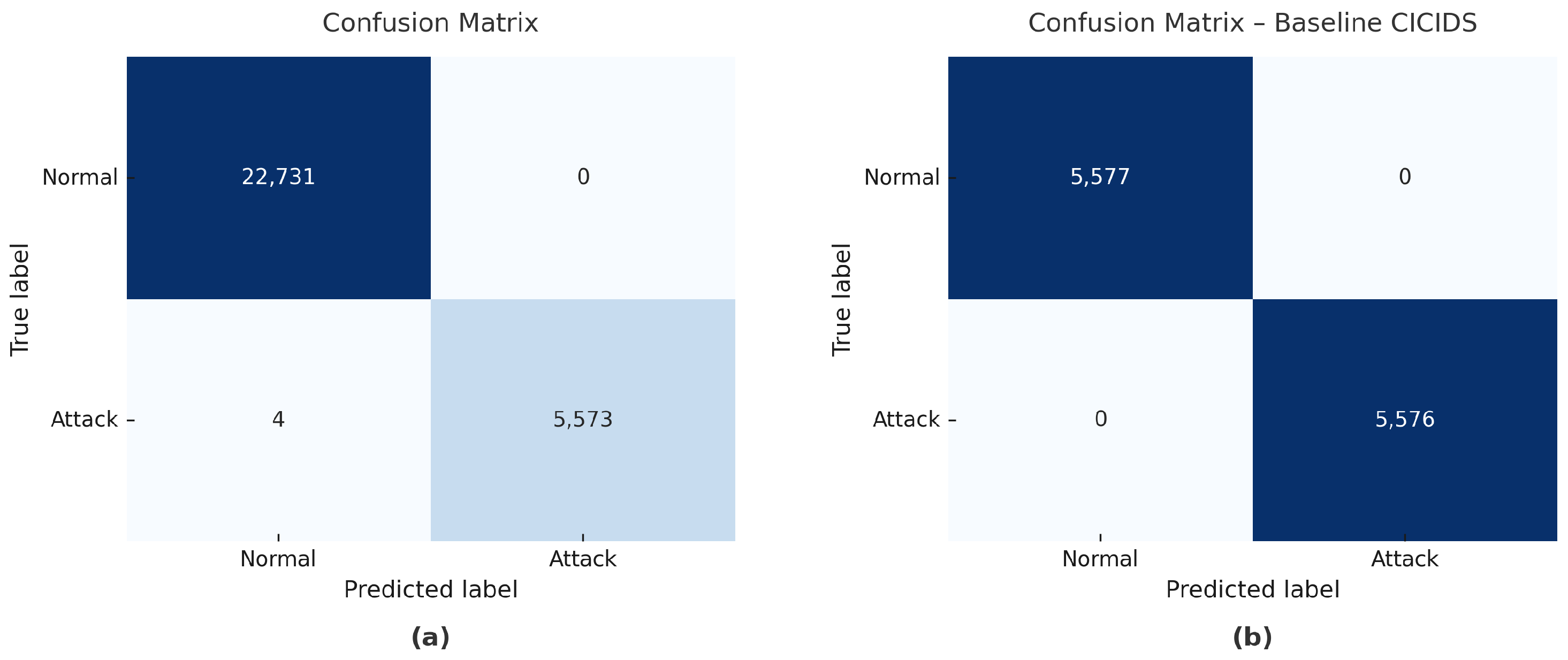 Figure 7a) produces 4 false positives and 4 false negatives, resulting in a false positive rate of 0.02% and a false negative rate of 0.07%. This balanced error distribution, while lower in absolute numbers compared to UNSW-NB15, maintains the characteristic pattern of controlled misclassification that indicates robust generalization. In contrast, the model trained on original CIC-IDS2017 data (