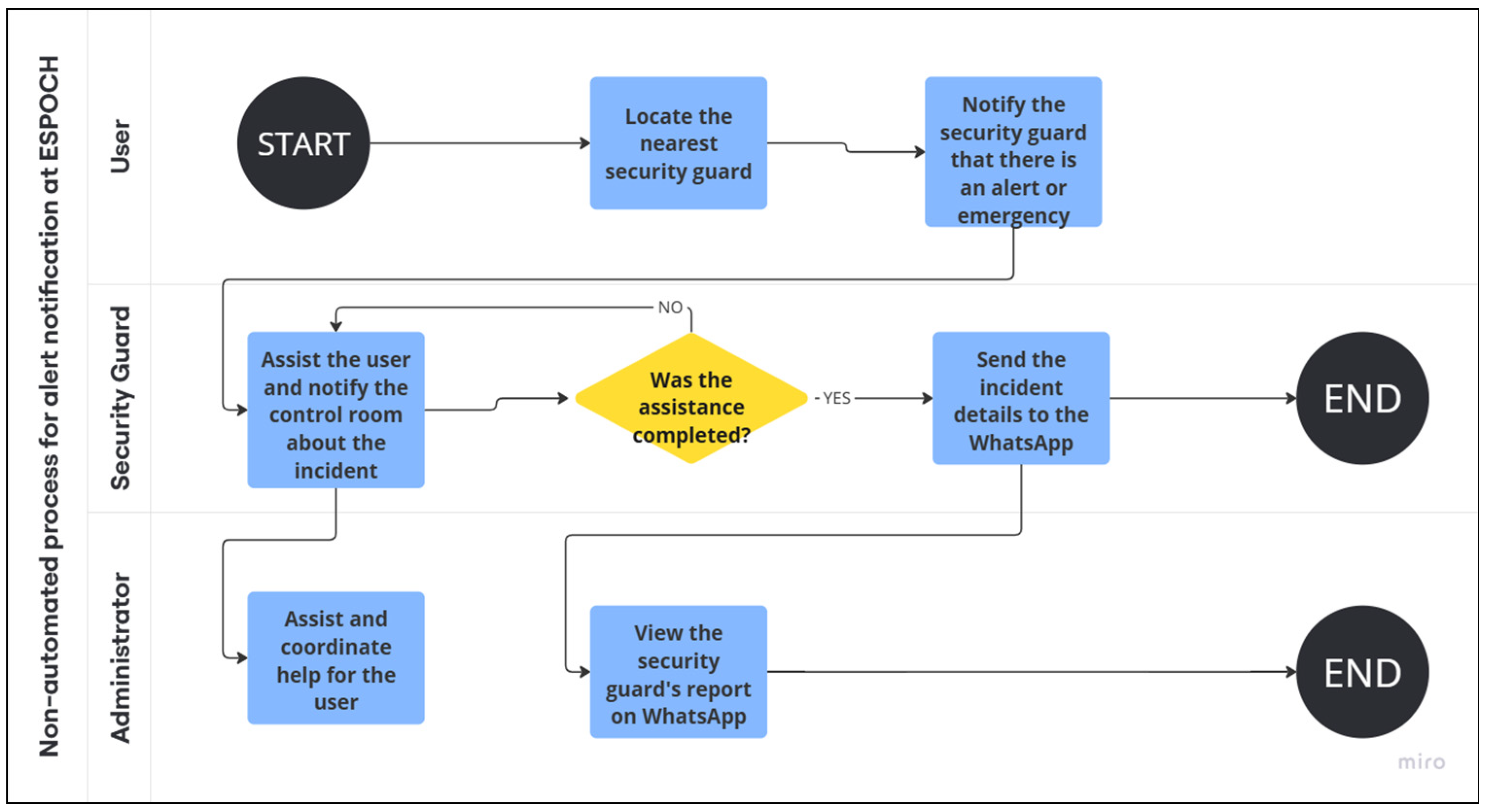 This description is essential within the context of the study, as the article focuses on the optimization of the emergency notification process, aiming to reduce response times and improve the traceability of the actions performed. It should be noted that the presented workflow constitutes the object of improvement in the case study, without delving into the specific actions taken by the security guard to resolve the alert.