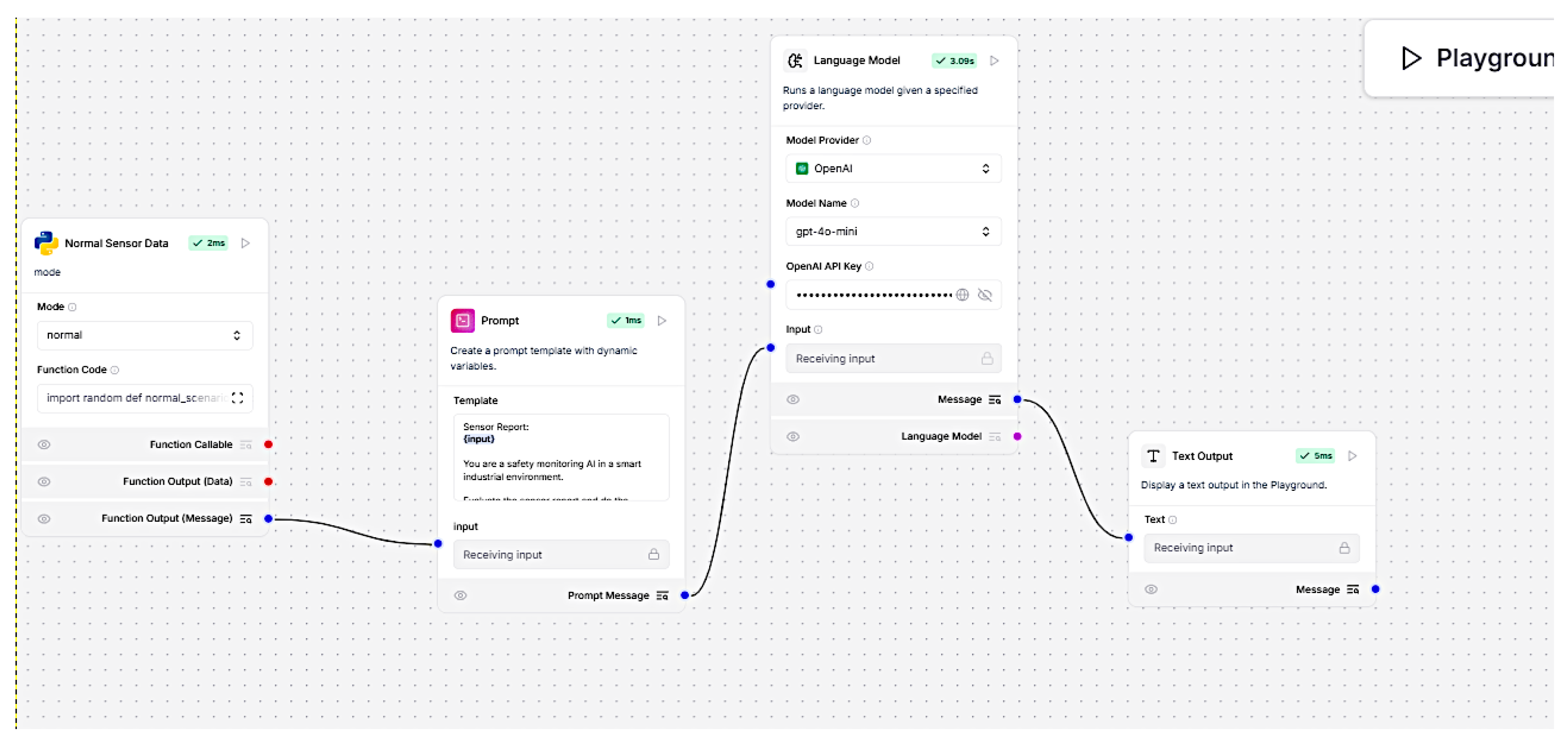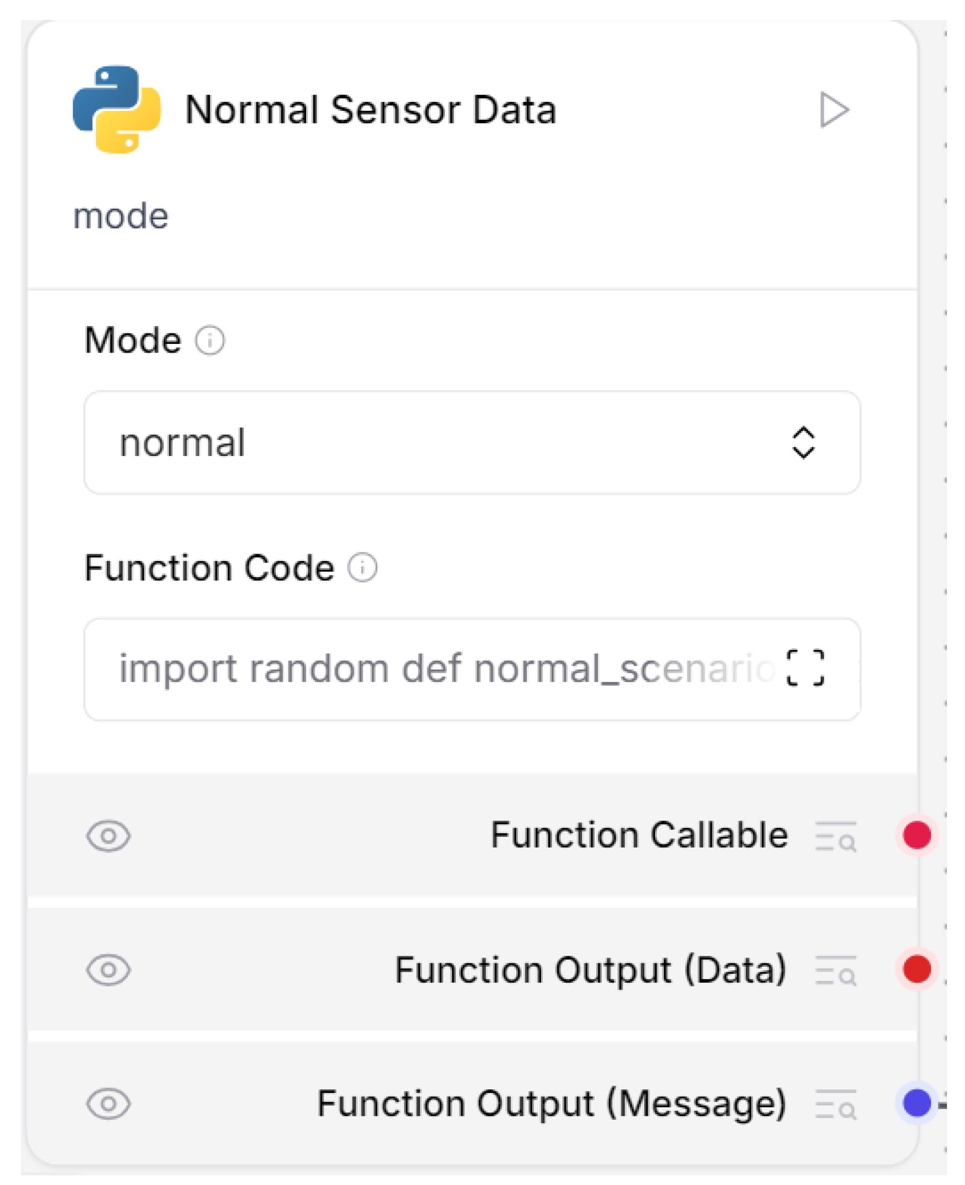 - Sensor input node: It was responsible for real-time input of sensor data The simulated sensors were temperature, vibration, humidity and pressure. The baseline readings were configured in the input node and sent to the sensor monitoring node. This was setting operational base line standards for normal system behavior. The data was sent to prompt node. The Figure 13 show input node.